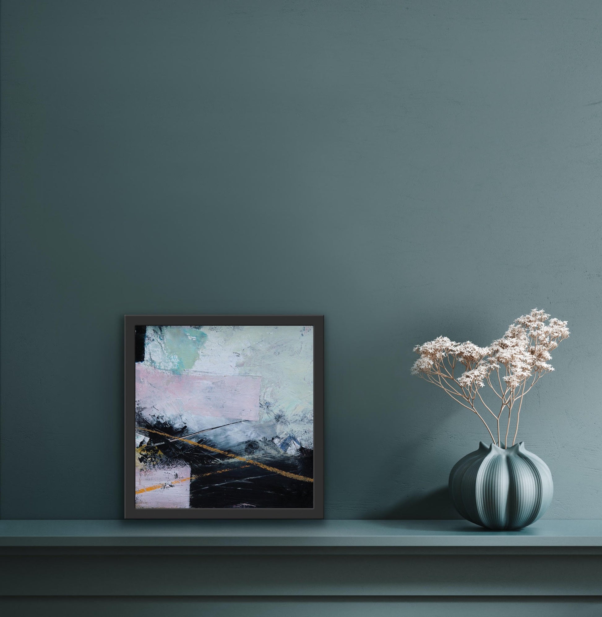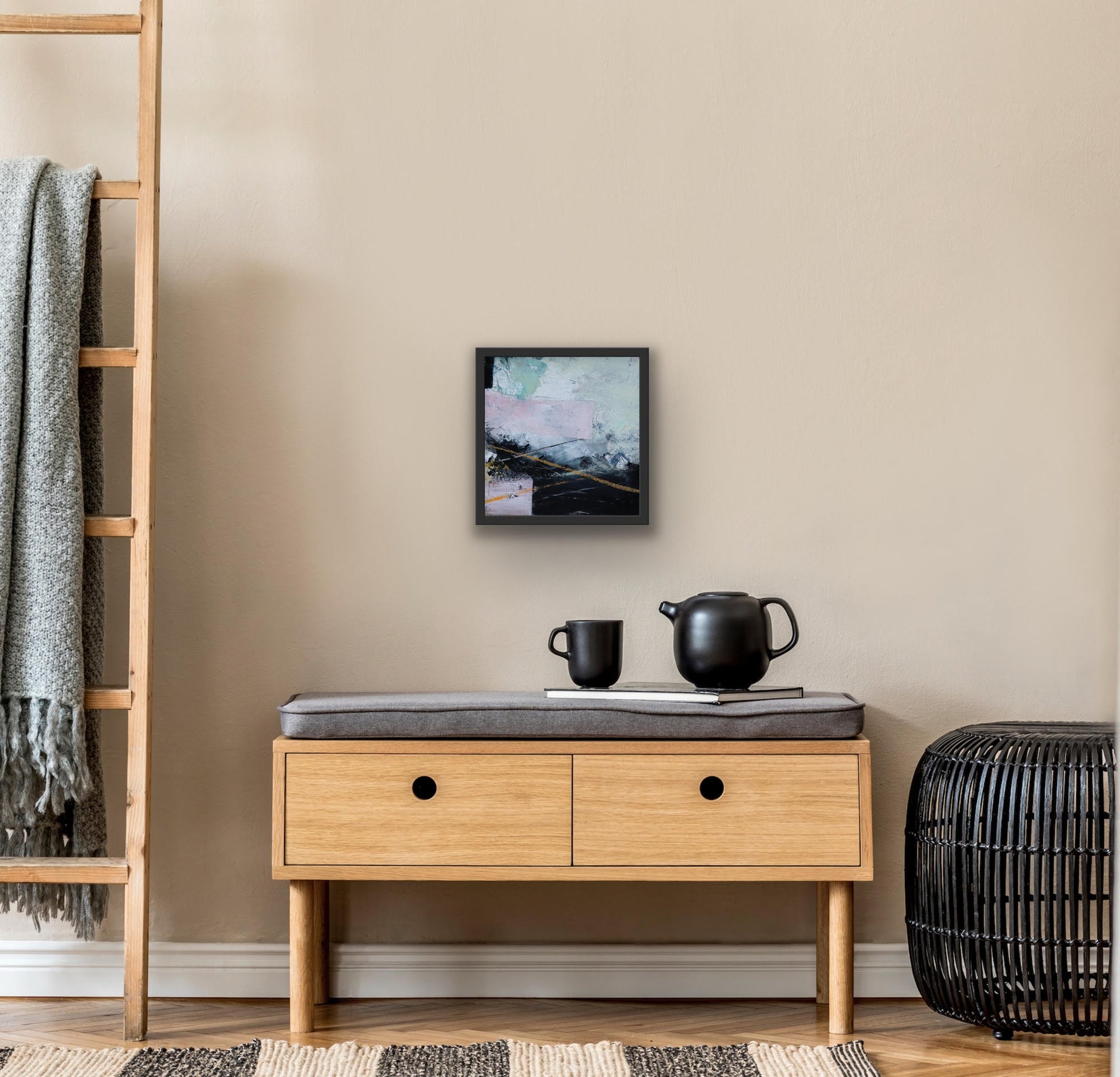 Some of my collections, such as the ‘At Home’ collection are created using oil paint with cold wax medium on wooden panels and applied with scrapers and knives. These original one off pieces are then framed in a St Ives wooden tray frame.