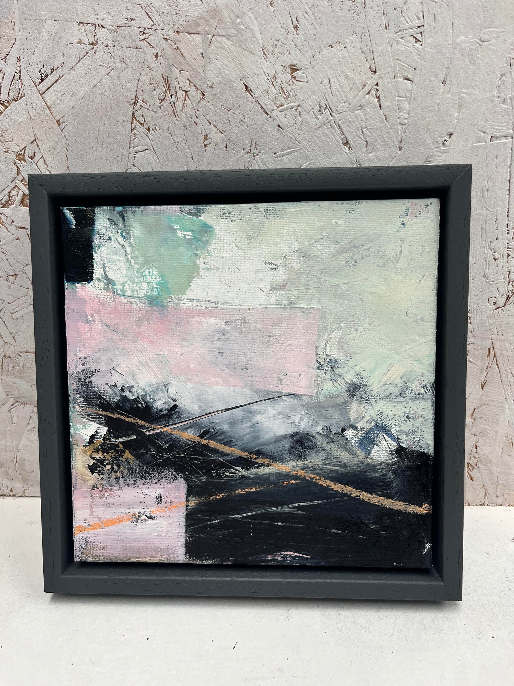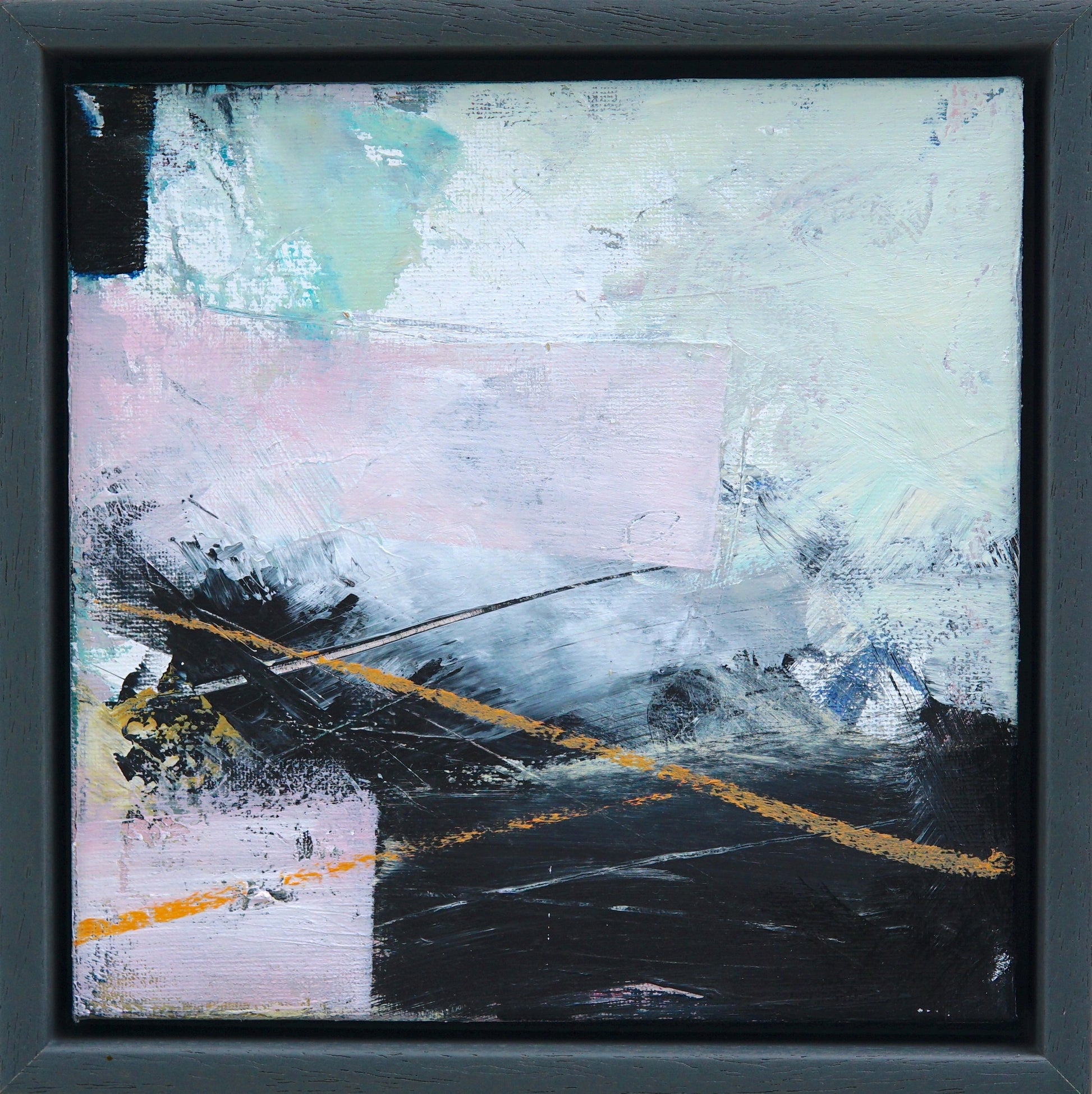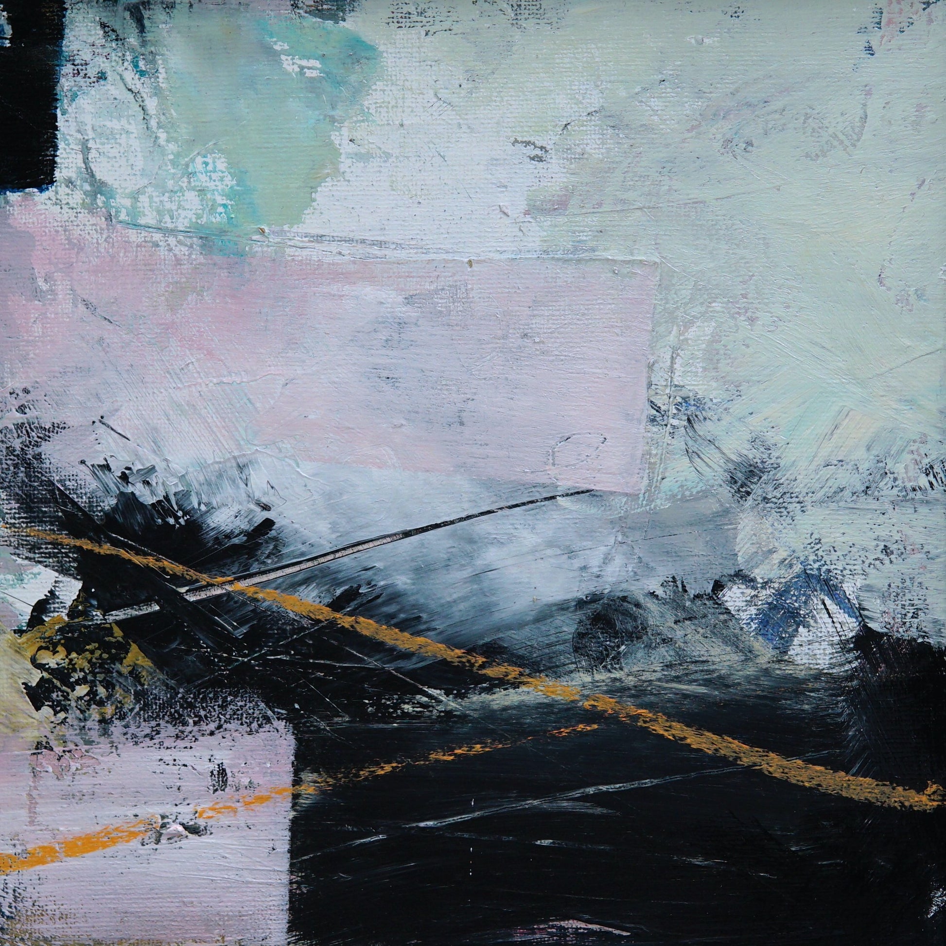 This abstract composition layers shapes and forms, light skies meeting dark waters, punctuated by vibrant orange lines and sweeping strokes of pink. Rich texture and movement distilled into a compact expression.