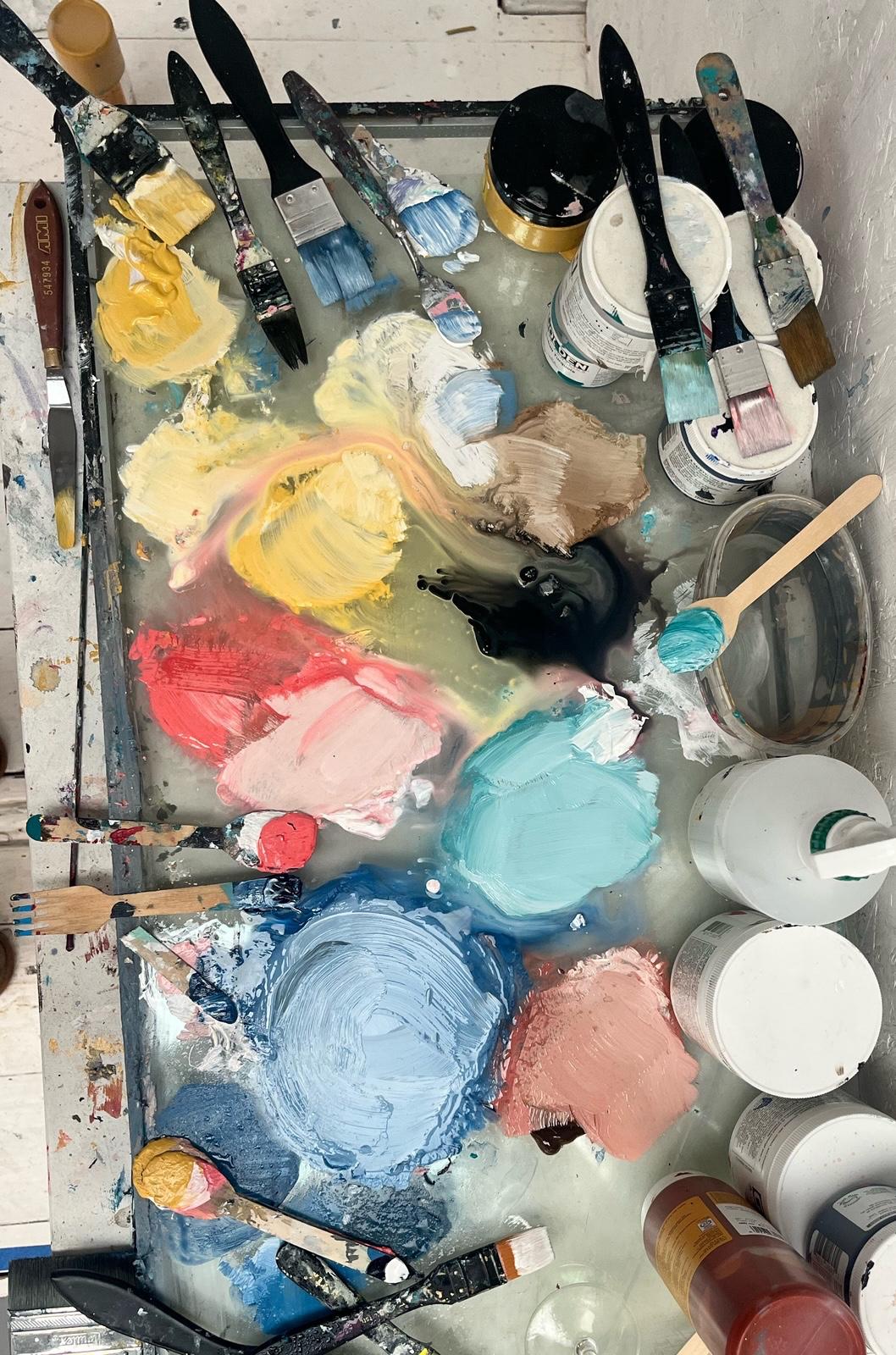 Saturday 18th and Sunday 19th April - These 2 days are our deep dive creative days in the studio - having independently had your breakfast and a gentle start to the day we will meet at the Arts Centre for 10am - your collection of paintings will be taking on their personality and style by now- I will explain further optional steps that you can take or you might be in your own flow and want to build on what you are already enjoying from your discoveries so far. We will have mini paper paintings on the go and other large paper pieces alongside the canvases. Rotating between your pieces to allow for drying time, there is opportunity to be trying a few directions at once. Experimentation and taking risks is encouraged and supported with a good variety of inspiration to fuel your creativity including a demonstration about colour mixing and tips around contrast, creating depth, adding motifs, finding images in your abstract work, creating space or adding pattern- but essentially supporting you with following your intuition and creative path.