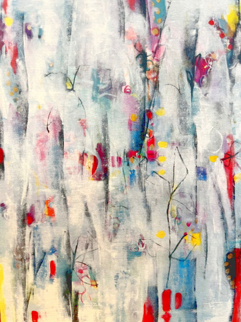 We'll work with mixed media on paper and large stretched canvas, practice experimentation, being playful and creating intuitively, building our work up in layers to develop narrative and depth.