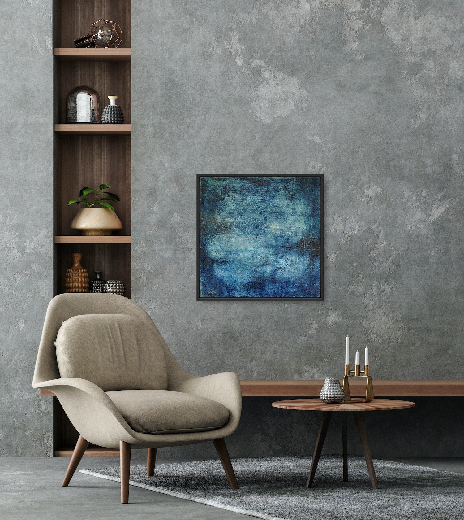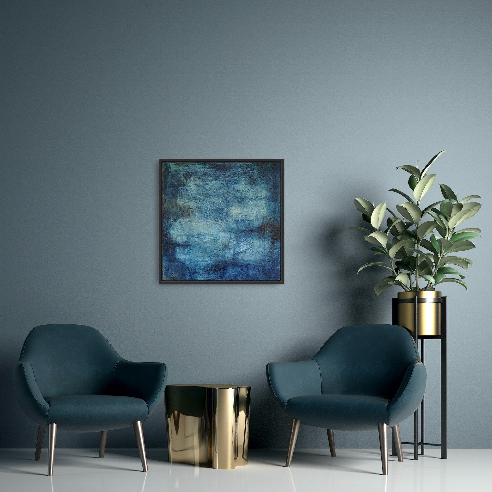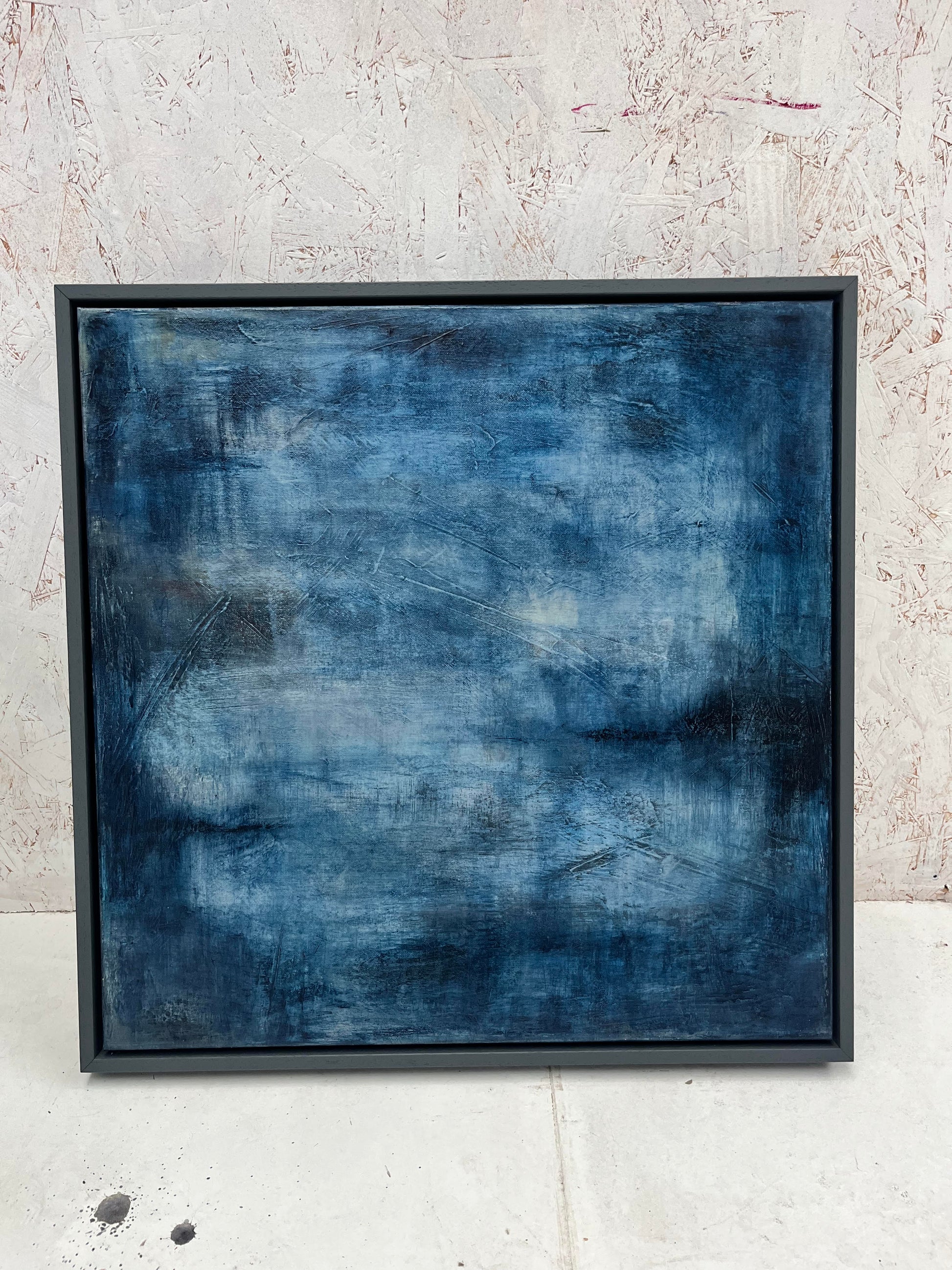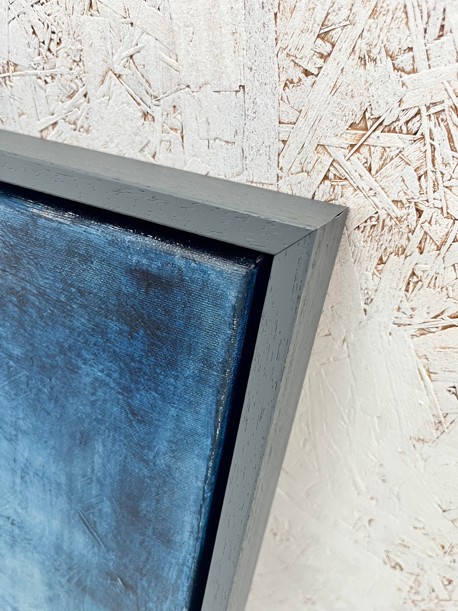 This atmospheric painting creates a sense of depth and mystery, inviting contemplation and calm. Framed in a grey tray frame, Before Light brings a rich, peaceful presence to a space, beautifully complementing both light and dark walls.