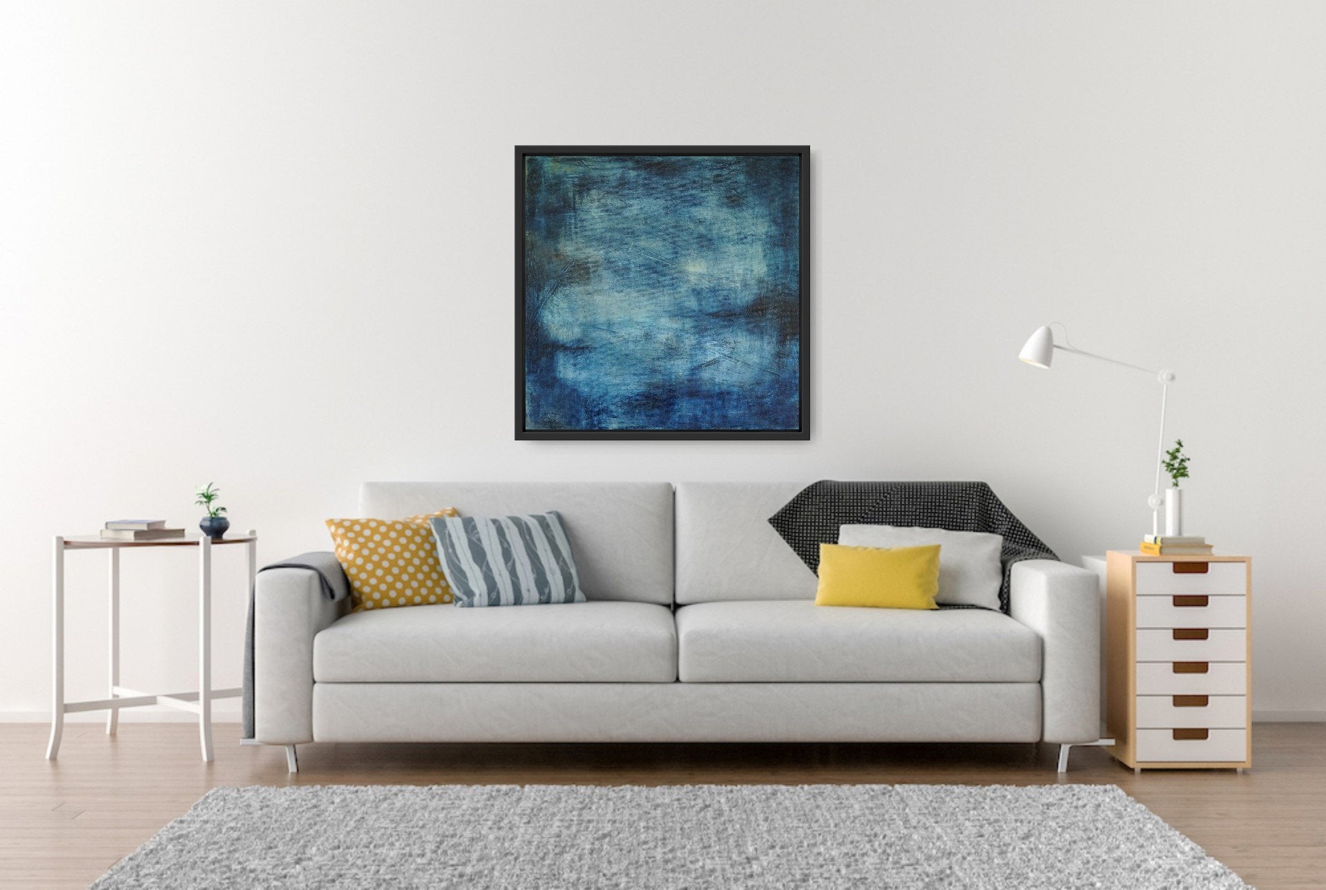 Framed in a classic white hardwood box frame, your original painting is delivered ready to hang.