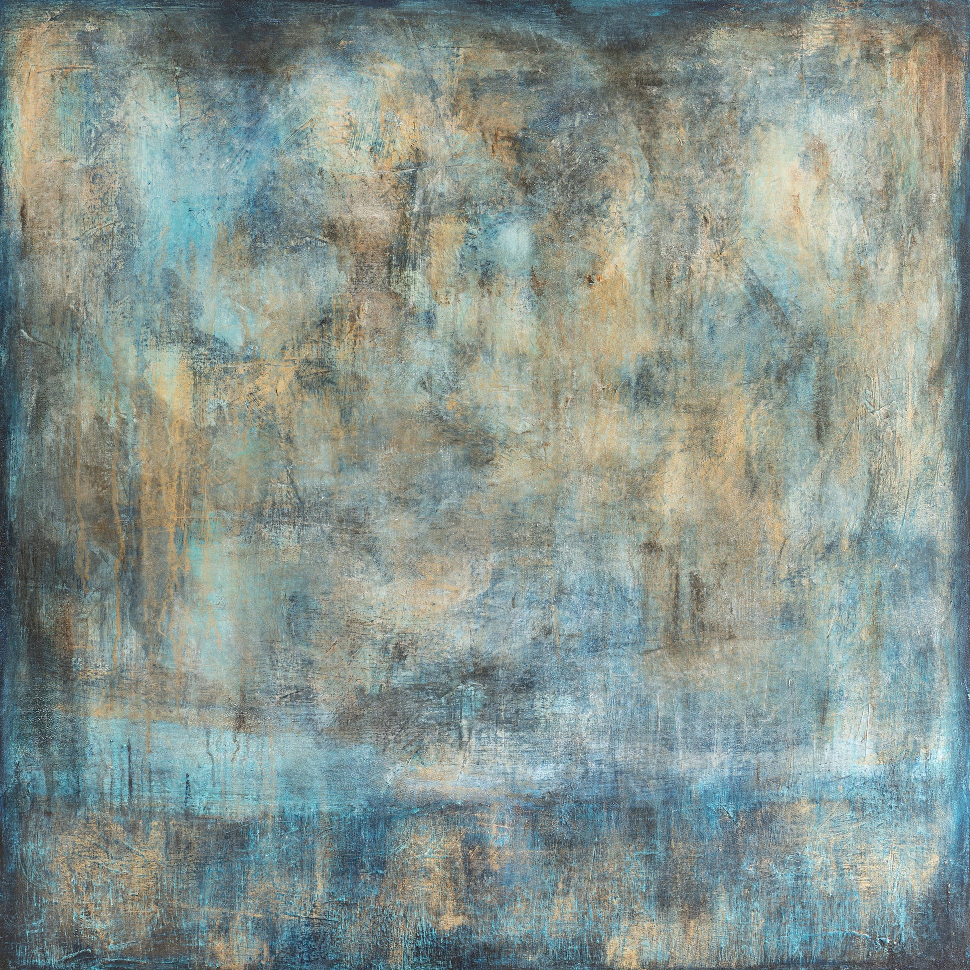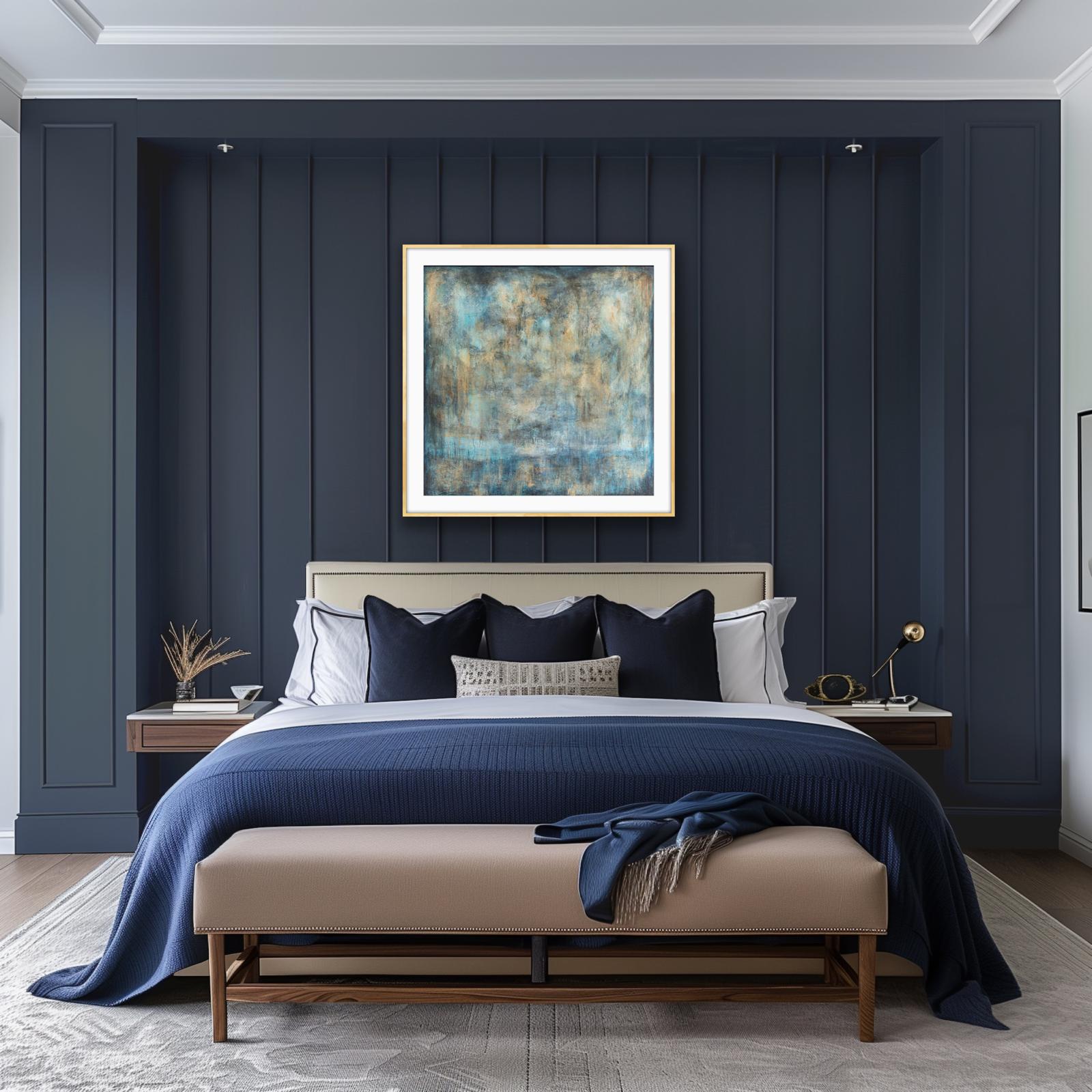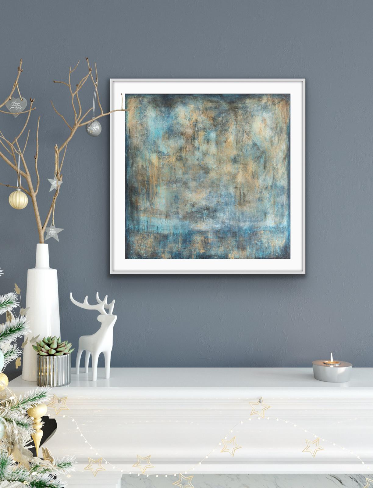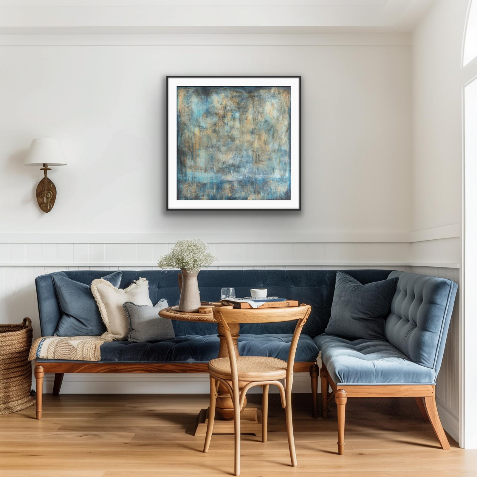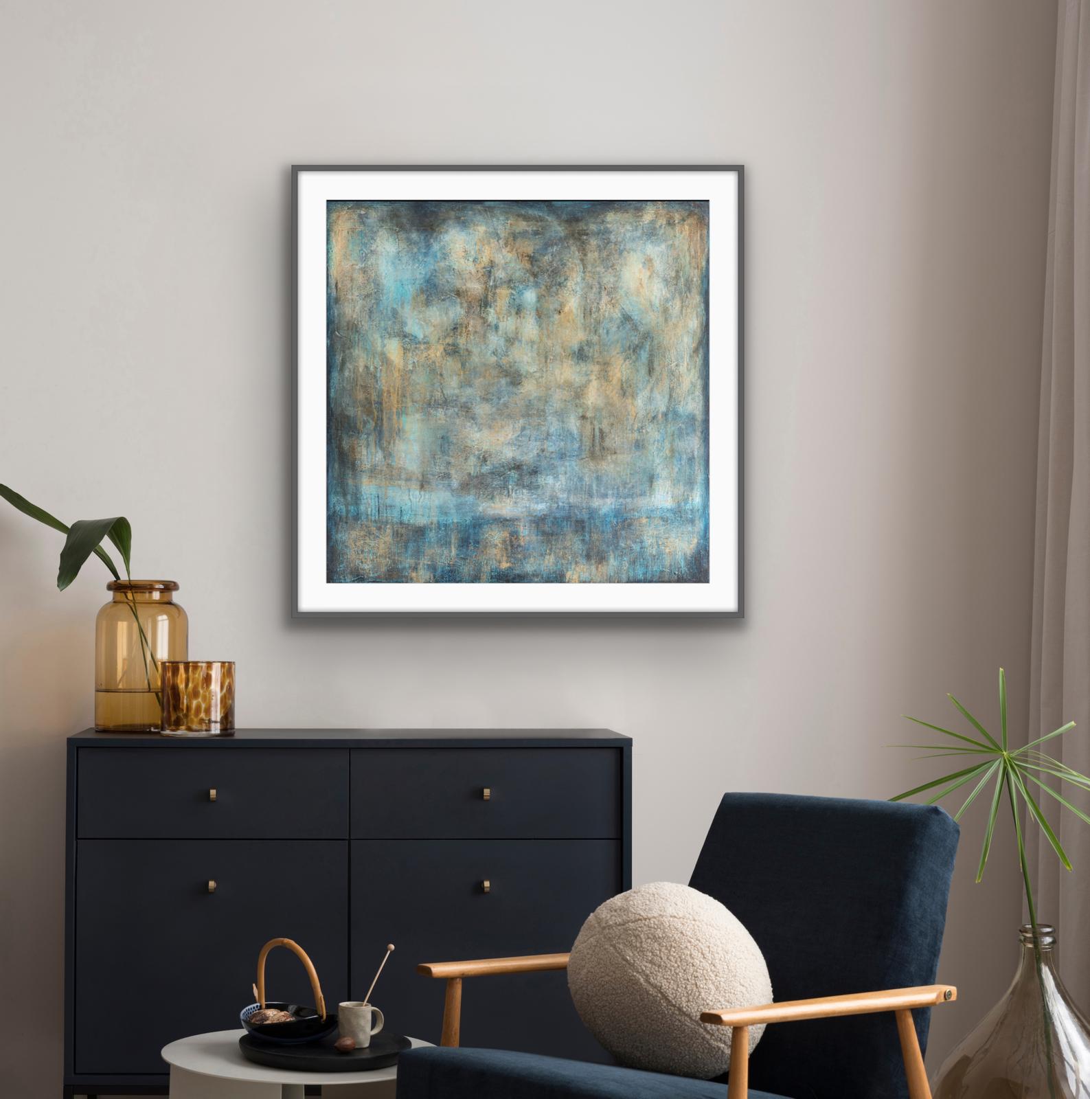 This majestic abstract painting commands presence with its shifts in tone and shades of blues and gold. Fading in and out to indicate dusk and dawn over water with suggestions of land within the darker vignette border.. It works equally as a large or small piece of wall art. The subtle detail created by texture and layering, this painting offers the viewer an opportunity to see the painting afresh over and over. It transfers really well into print and can add a sense of both drama and calm to your home or workspace. It sits well against either dark and light interiors.