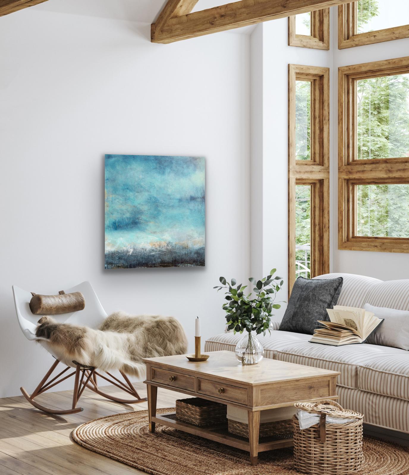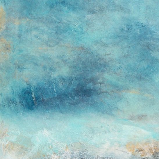 Beautiful washes of teal and prussian blue with pops of gold create immersive depth to this abstract painting