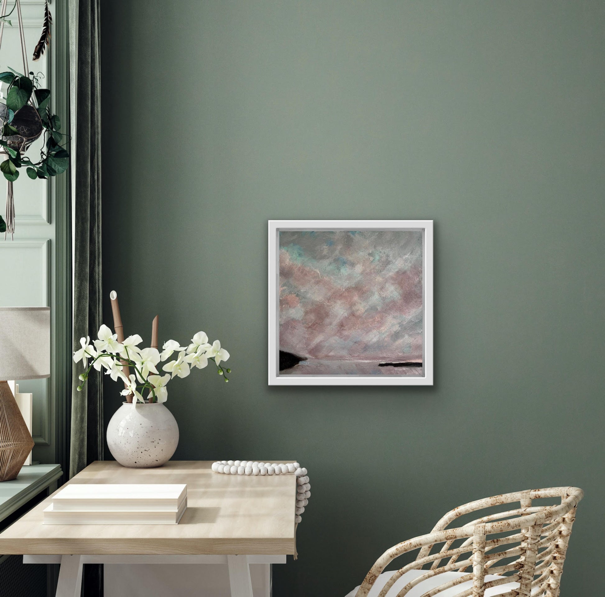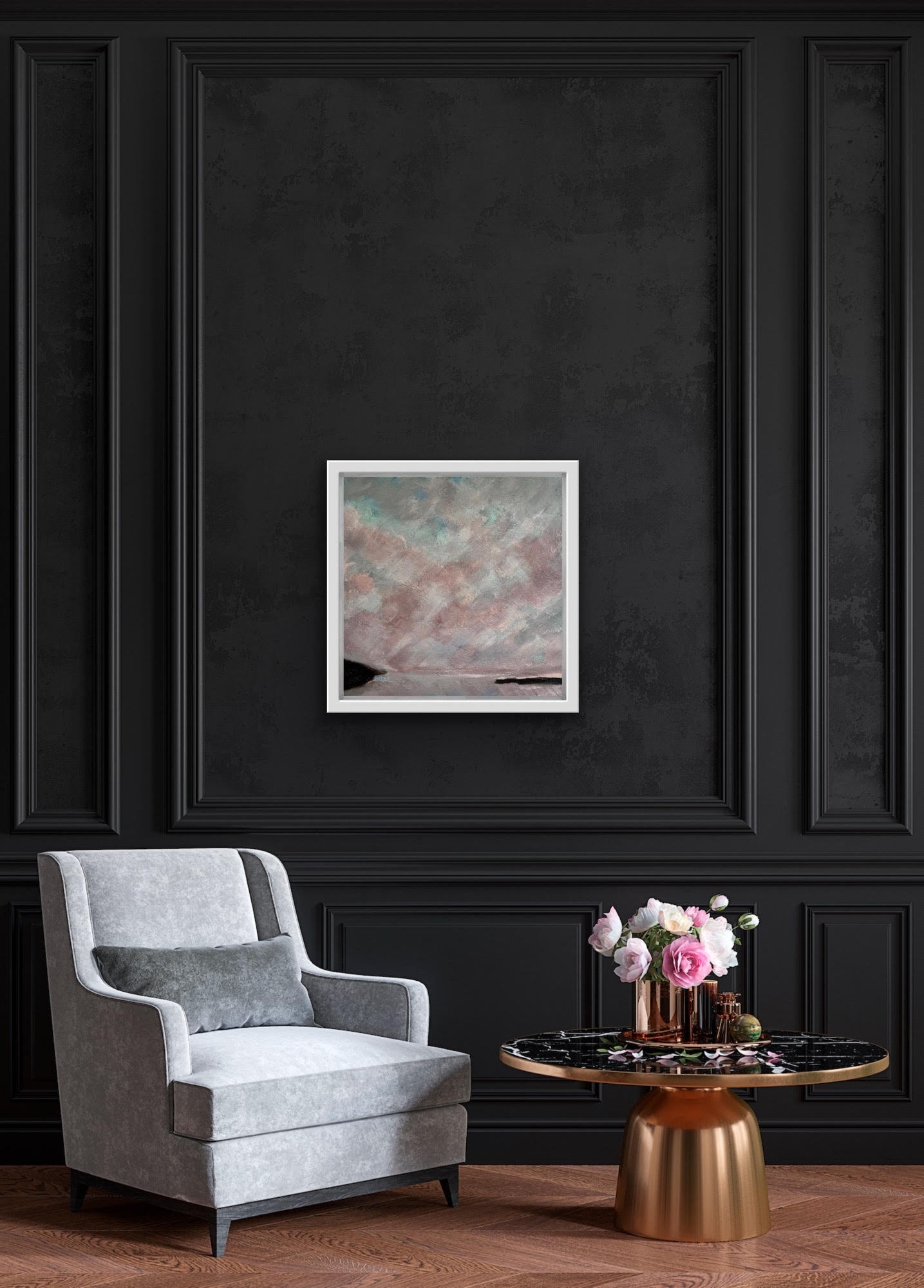 'Ocean Love' celebrates the enchanting beauty of a mackerel sky sunset. Soft pink hues drench the spacious beach reflected from the glowing sky above. Layers of grey, white, and blush intertwine against the dark silhouettes of rocks at the water’s edge, capturing the quiet magic of an open, deserted Cornish shore at low tide.