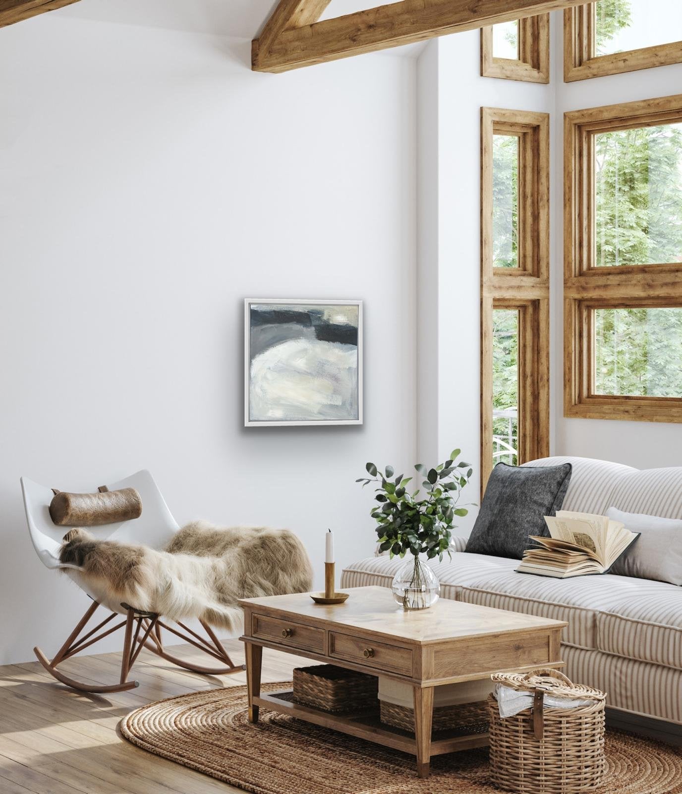 Framed in a classic white hardwood box frame, your original painting is delivered ready to hang.