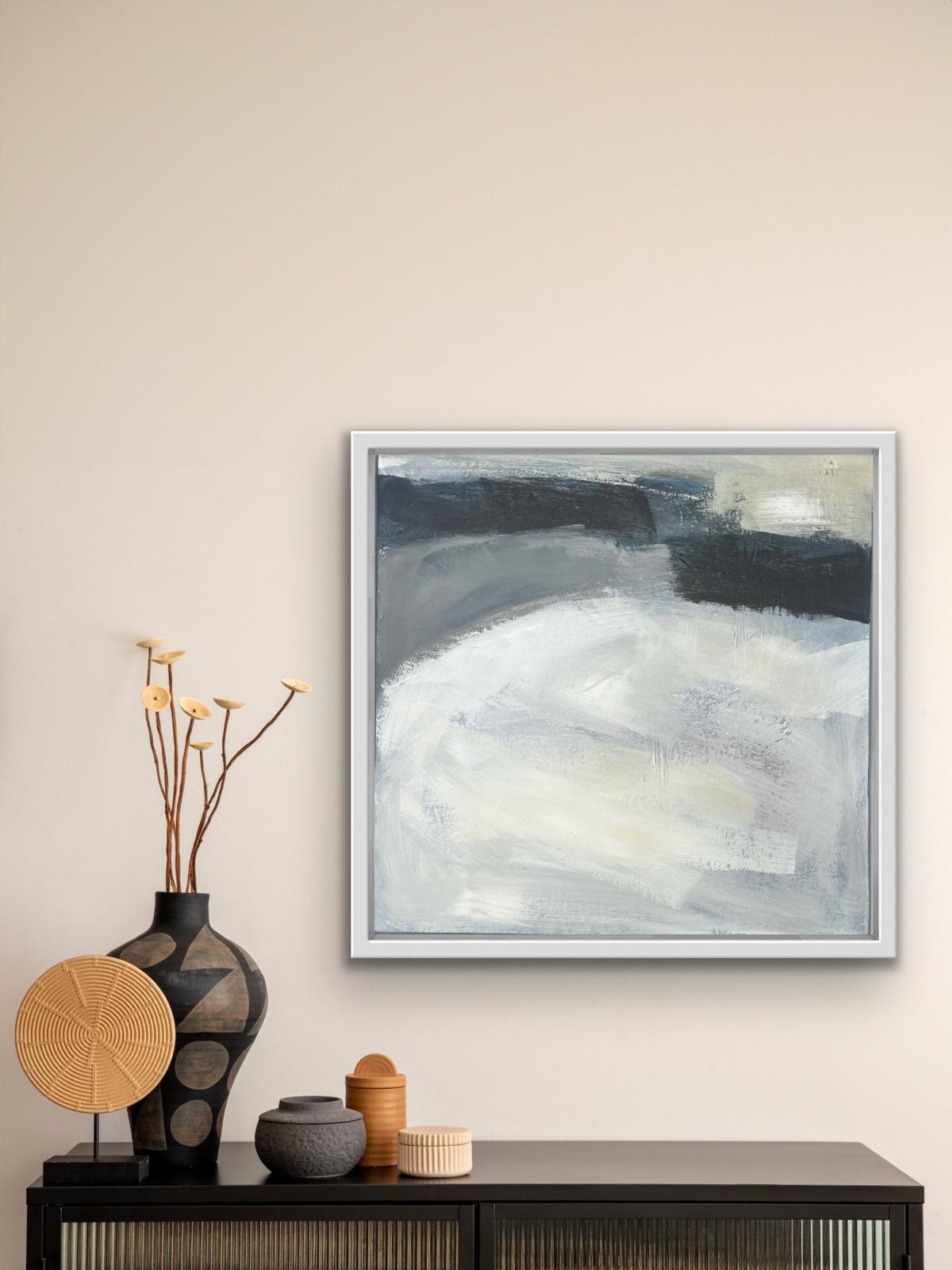 Some of my collections, such as the ‘At Home’ collection are created using oil paint with cold wax medium on wooden panels and applied with scrapers and knives. These original one off pieces are then framed in a St Ives wooden tray frame.