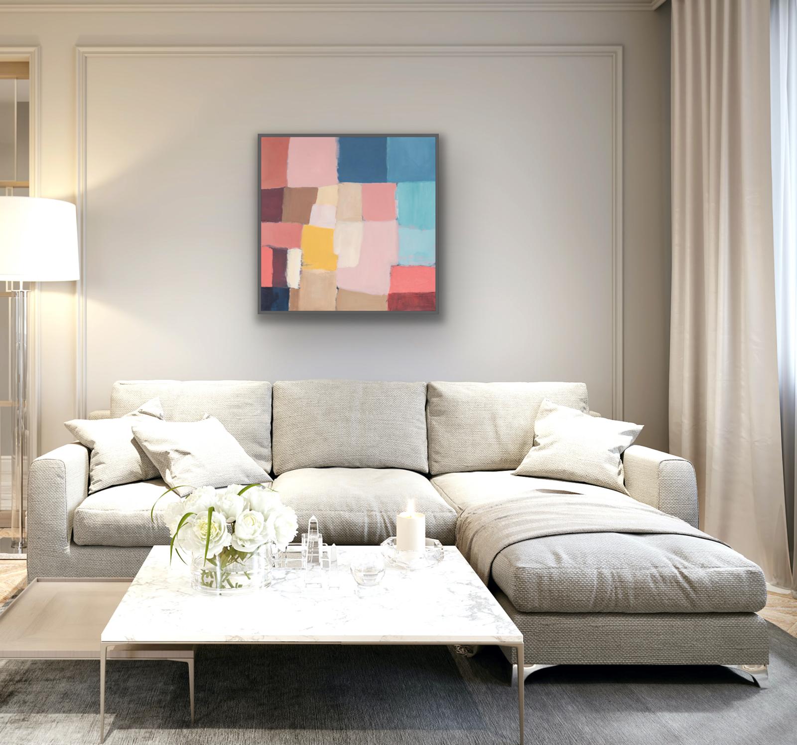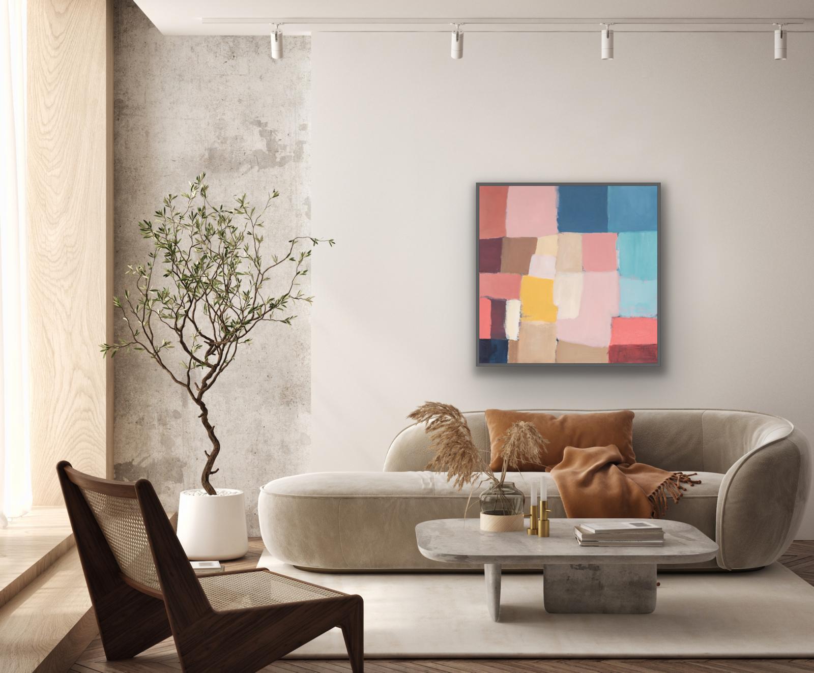 As part of a series of studies, ‘Reimagined Land 1’, draws inspiration from the shapes of the fields and boundary lines that carve the Devon landscape Using colours to reshape and reassemble the composition to create a sense of calm yet playful abstraction inviting the viewer to see the landscape through a fresh lens. This original framed painting on canvas brings a relaxing but bright feel to the space.