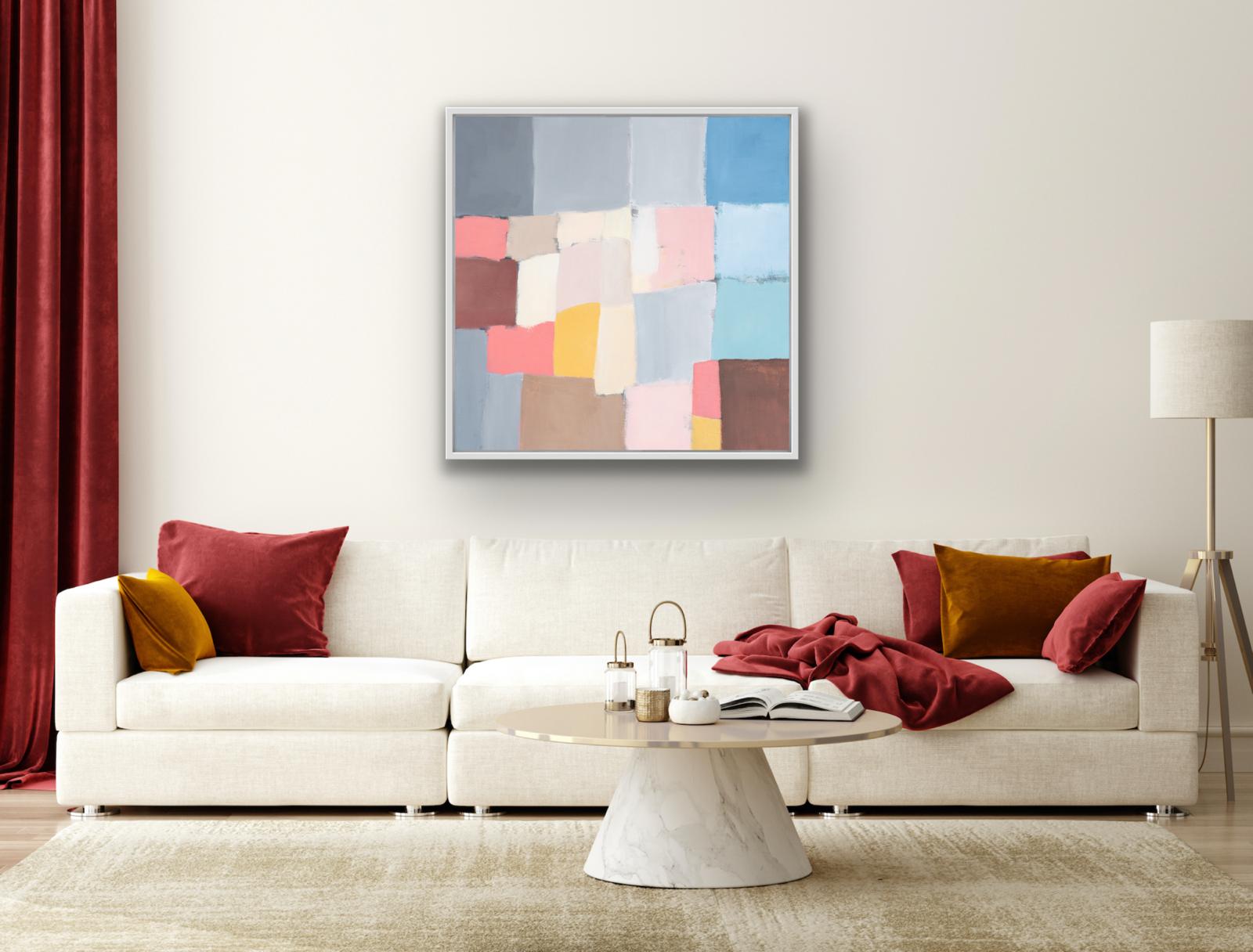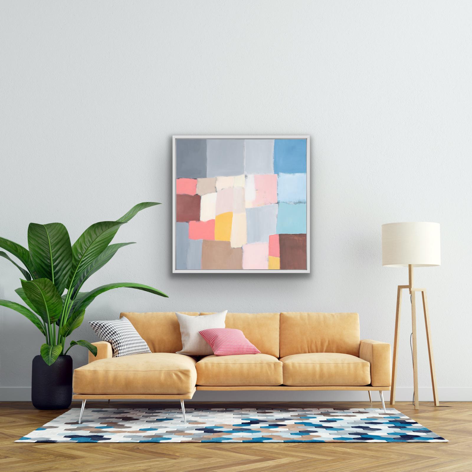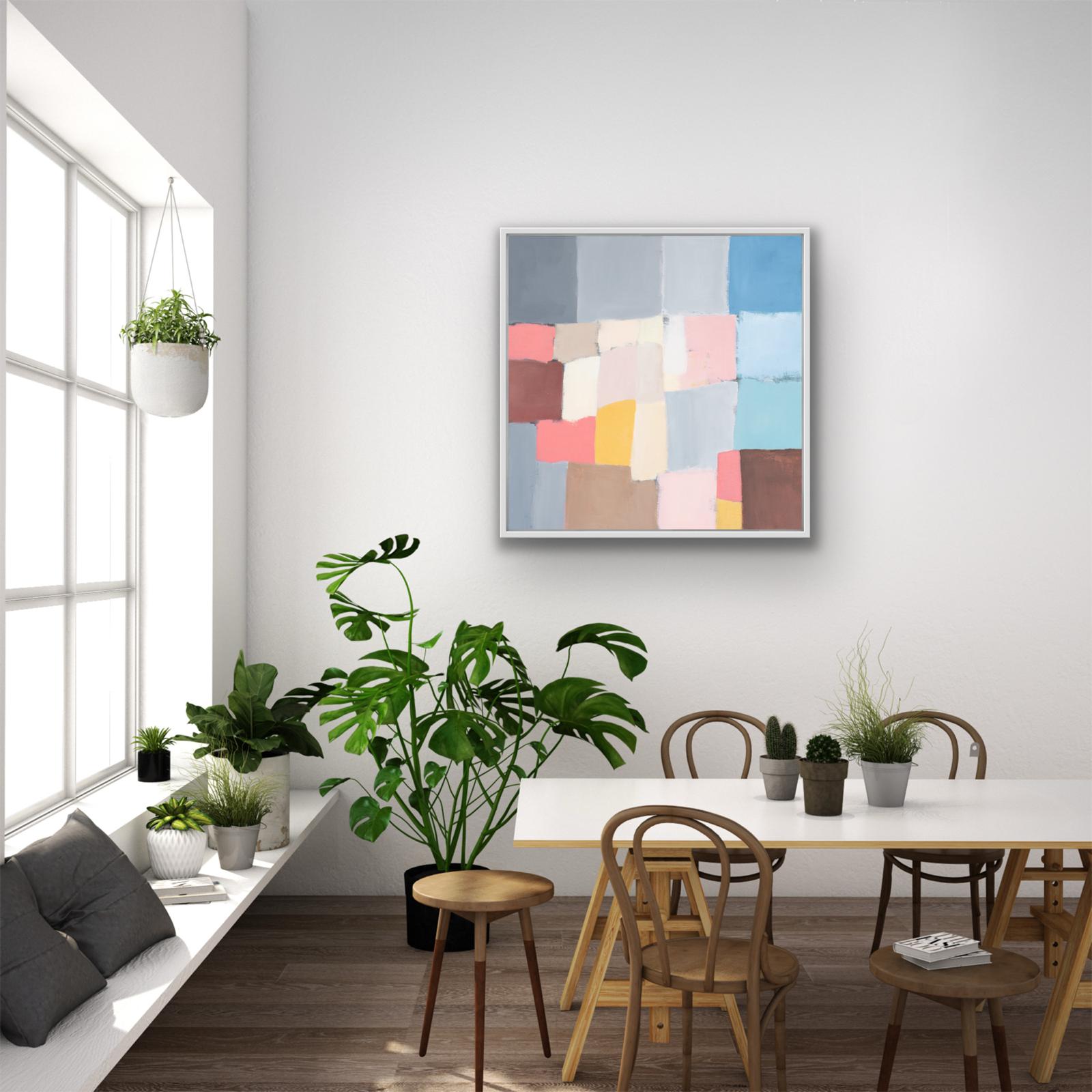 As part of a series of studies, ‘Reimagined Land 1’, draws inspiration from the shapes of the fields and boundary lines that carve the Devon landscape Using colours to reshape and reassemble the composition to create a sense of calm yet playful abstraction inviting the viewer to see the landscape through a fresh lens. This original framed painting on canvas brings a relaxing but bright feel to the space.