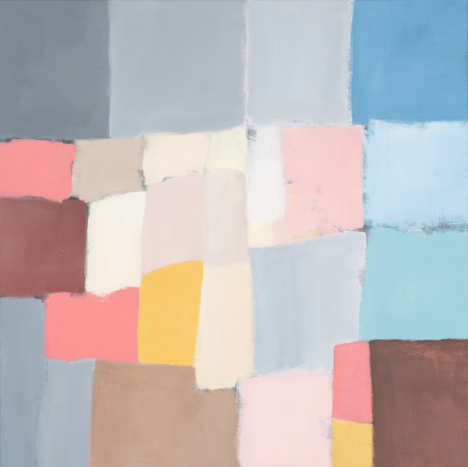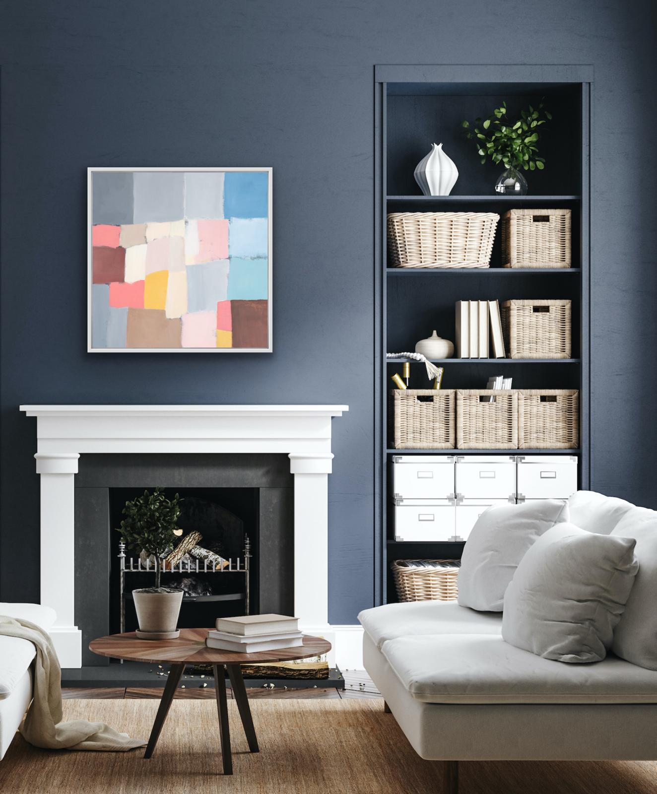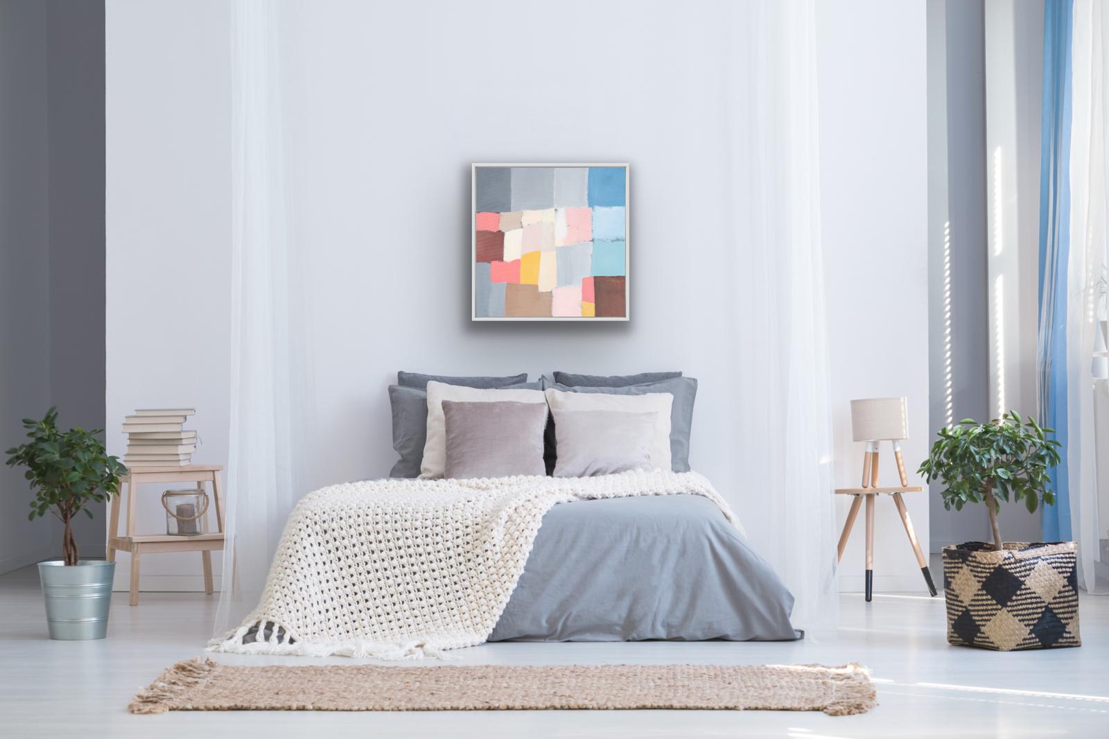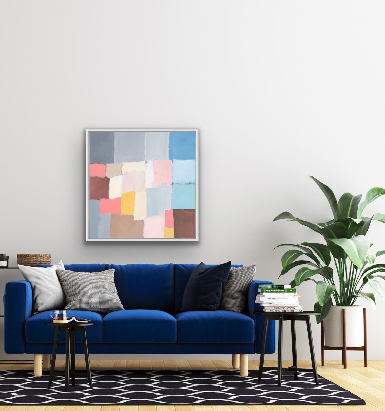 As part of a series of studies, ‘Reimagined Land 1’, draws inspiration from the shapes of the fields and boundary lines that carve the Devon landscape Using colours to reshape and reassemble the composition to create a sense of calm yet playful abstraction inviting the viewer to see the landscape through a fresh lens. This original framed painting on canvas brings a relaxing but bright feel to the space.