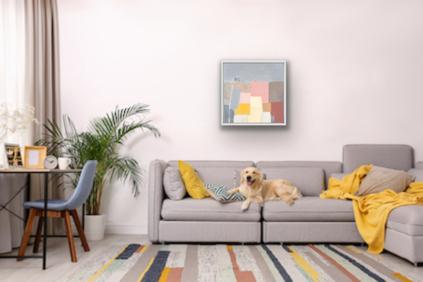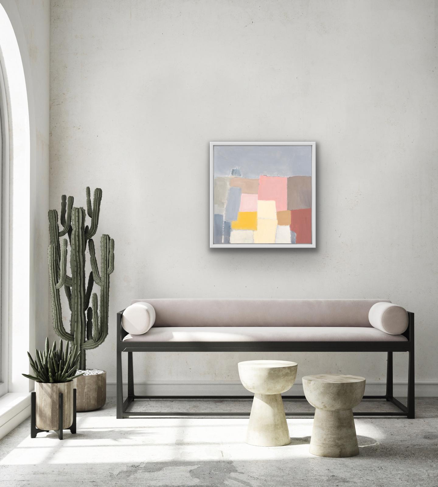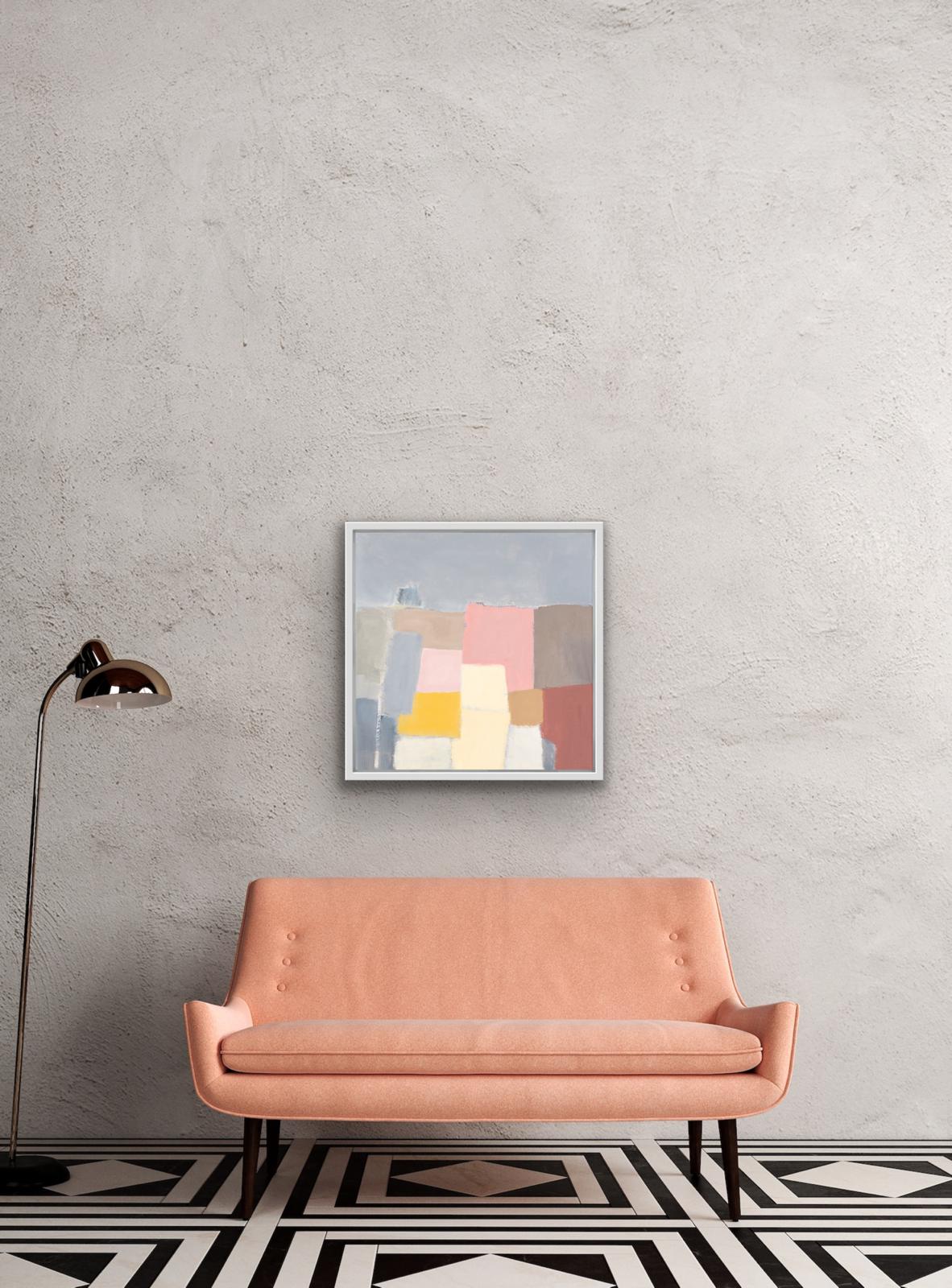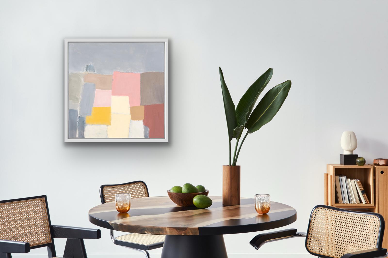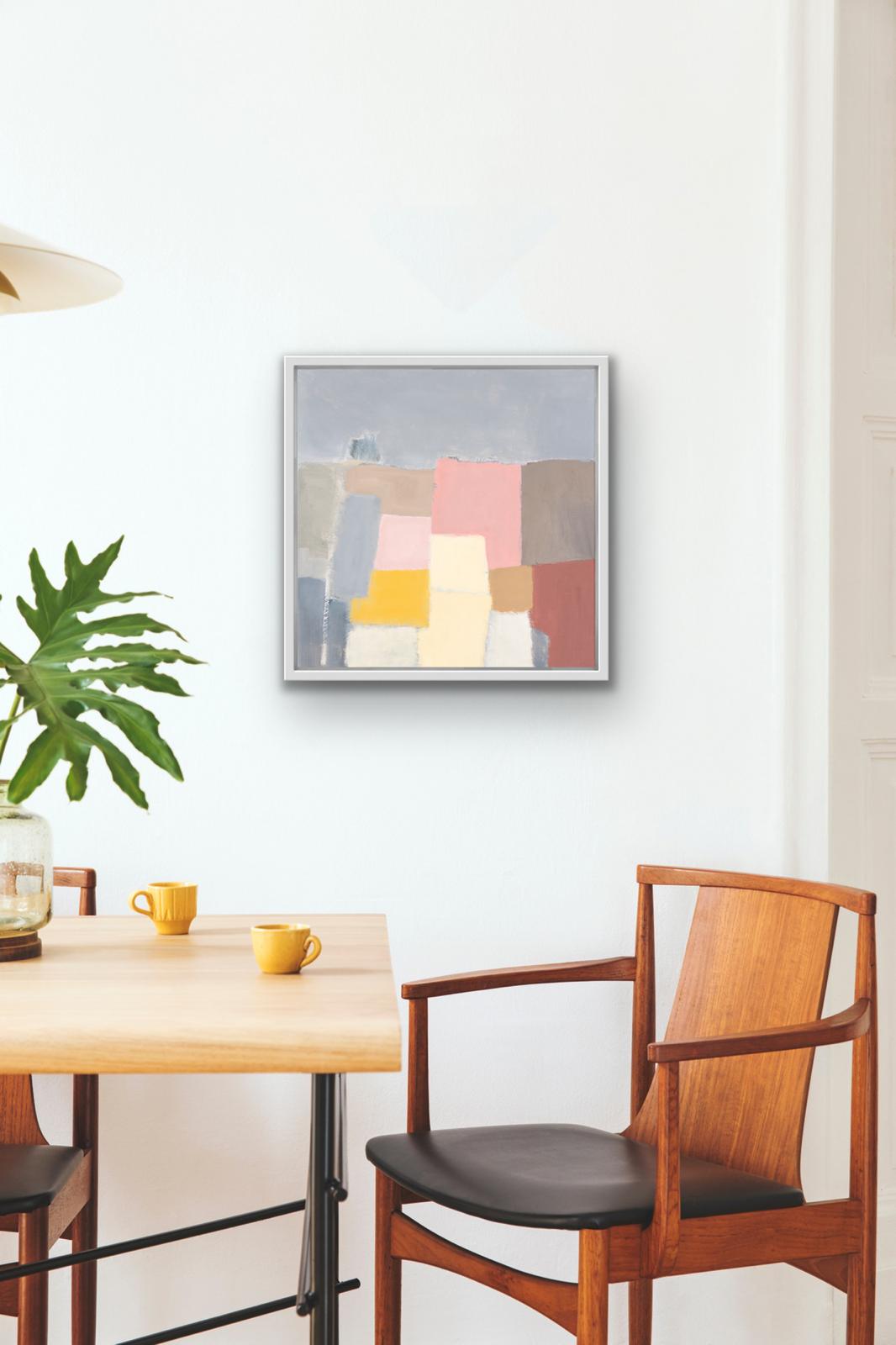As part of a series of studies, ‘Reimagined Land 3’, draws inspiration from the shapes of the fields and boundary lines that carve the Devon landscape Using colours to reshape and reassemble the composition to create a sense of calm yet playful abstraction inviting the viewer to see the landscape through a fresh lens. This original framed painting on canvas brings a relaxing but bright feel to the space.