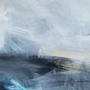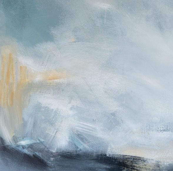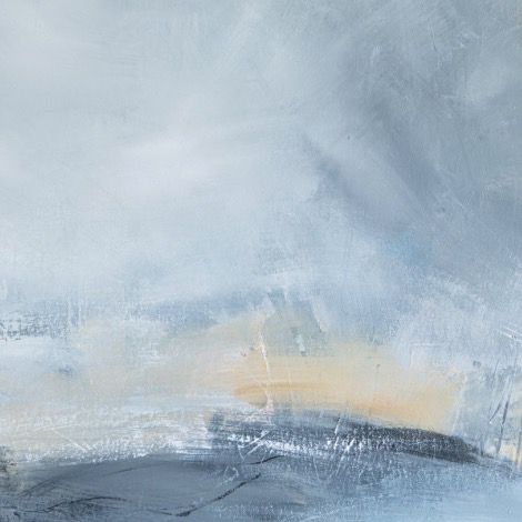 Muted tones and a minimal composition with a pop of teal and raw umber with greys and whites, a spacious painting with energetic gestural brushstrokes creating the atmosphere of a moody land and skyscape.