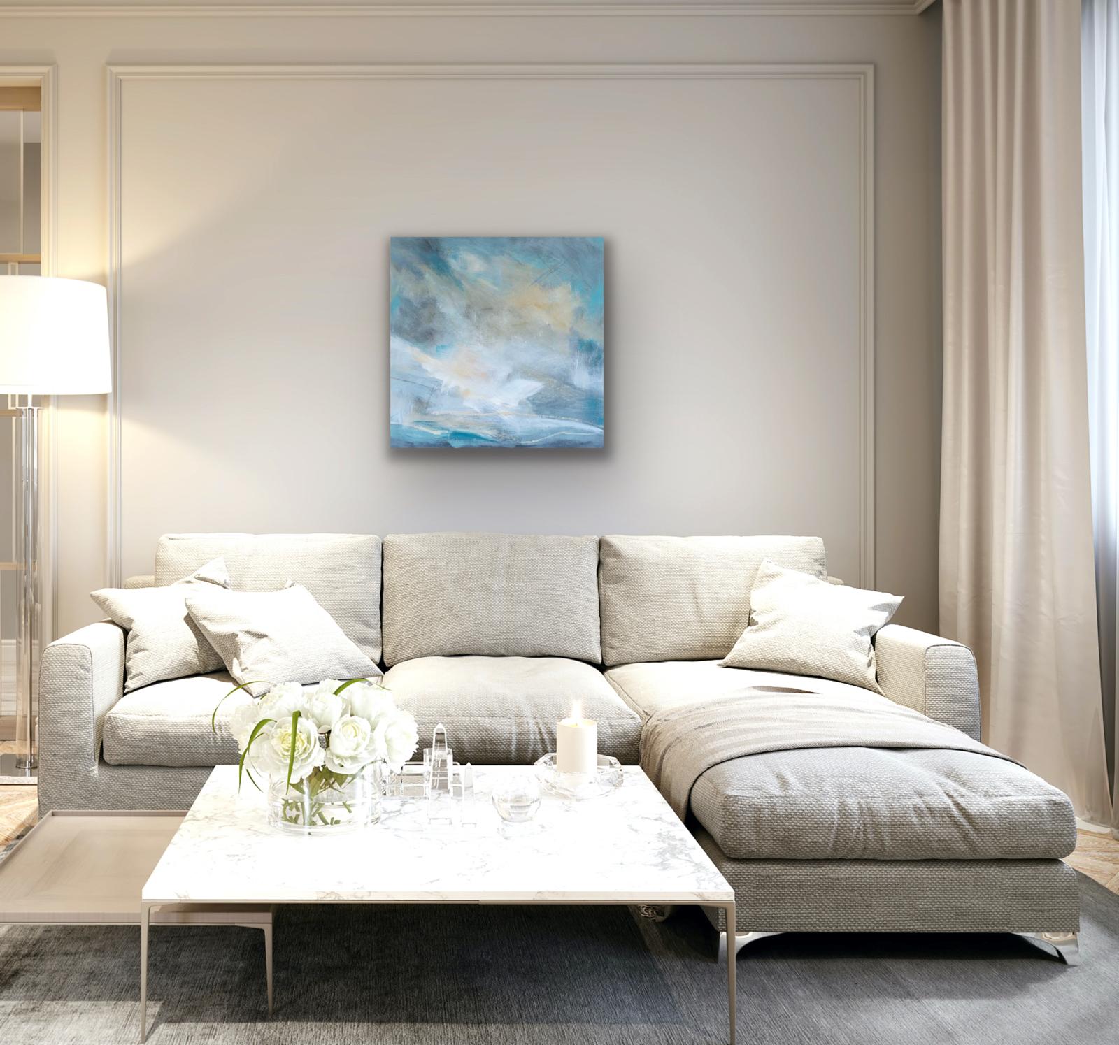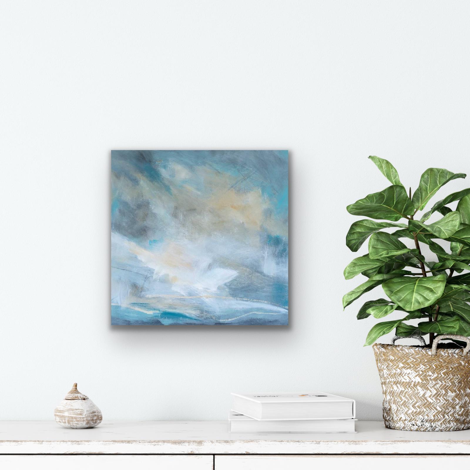 Calm, soft blue, grey expansive sky painting with contrasting abstract horizon lines