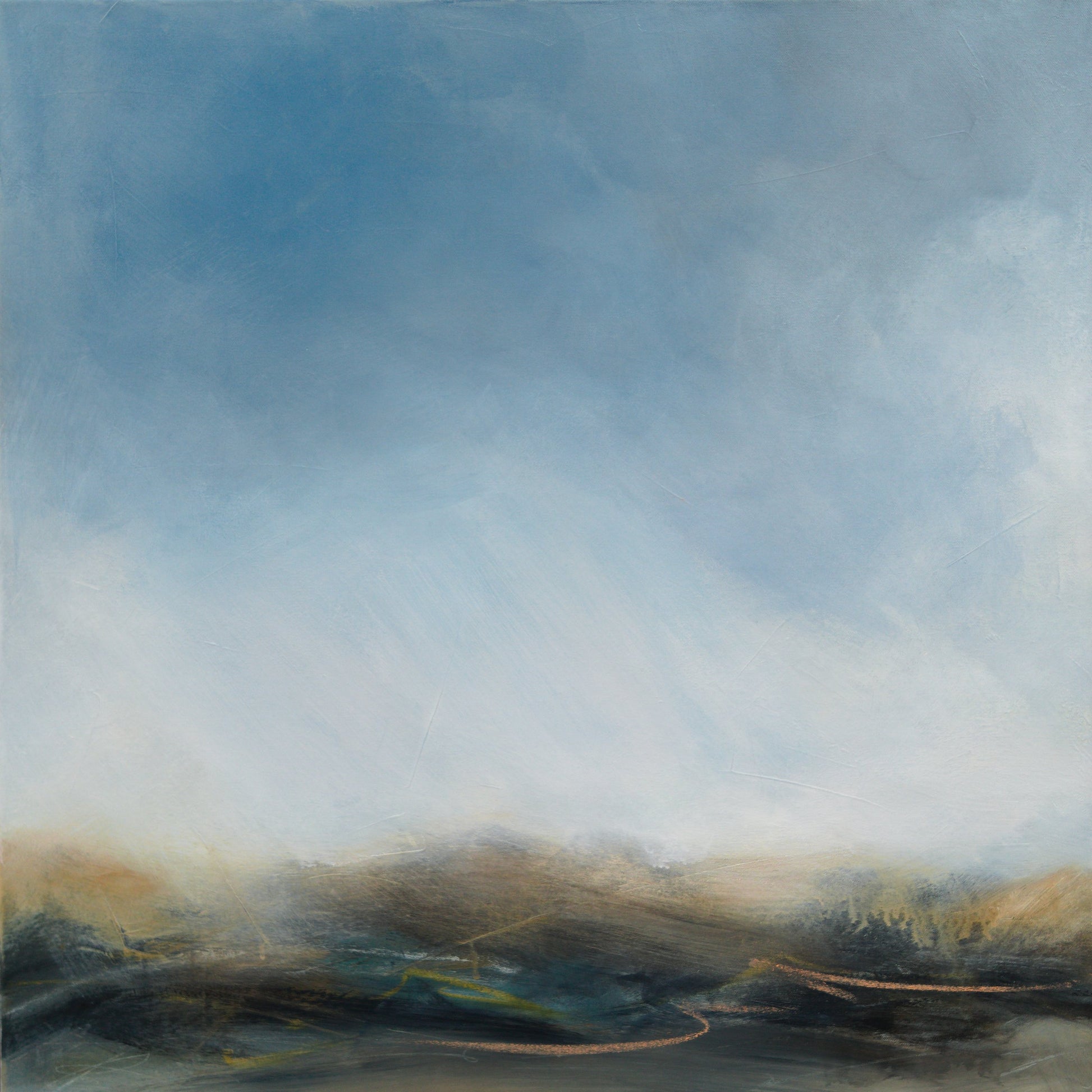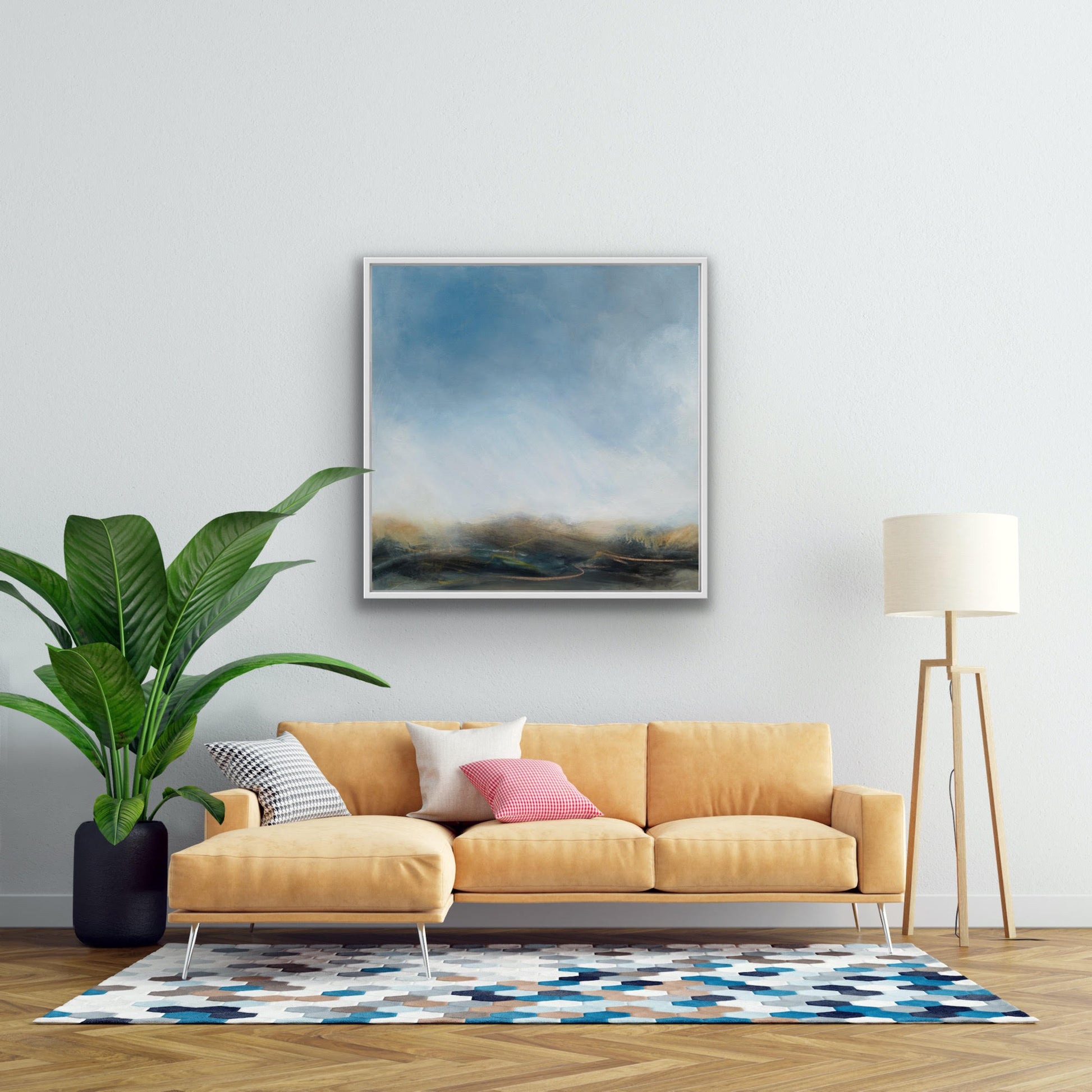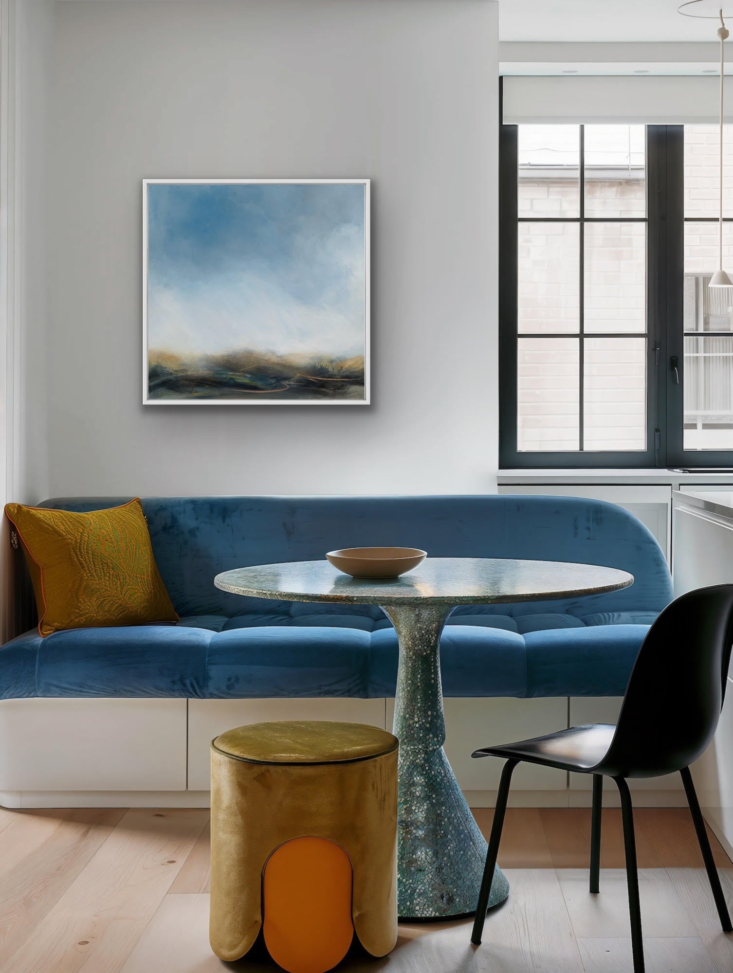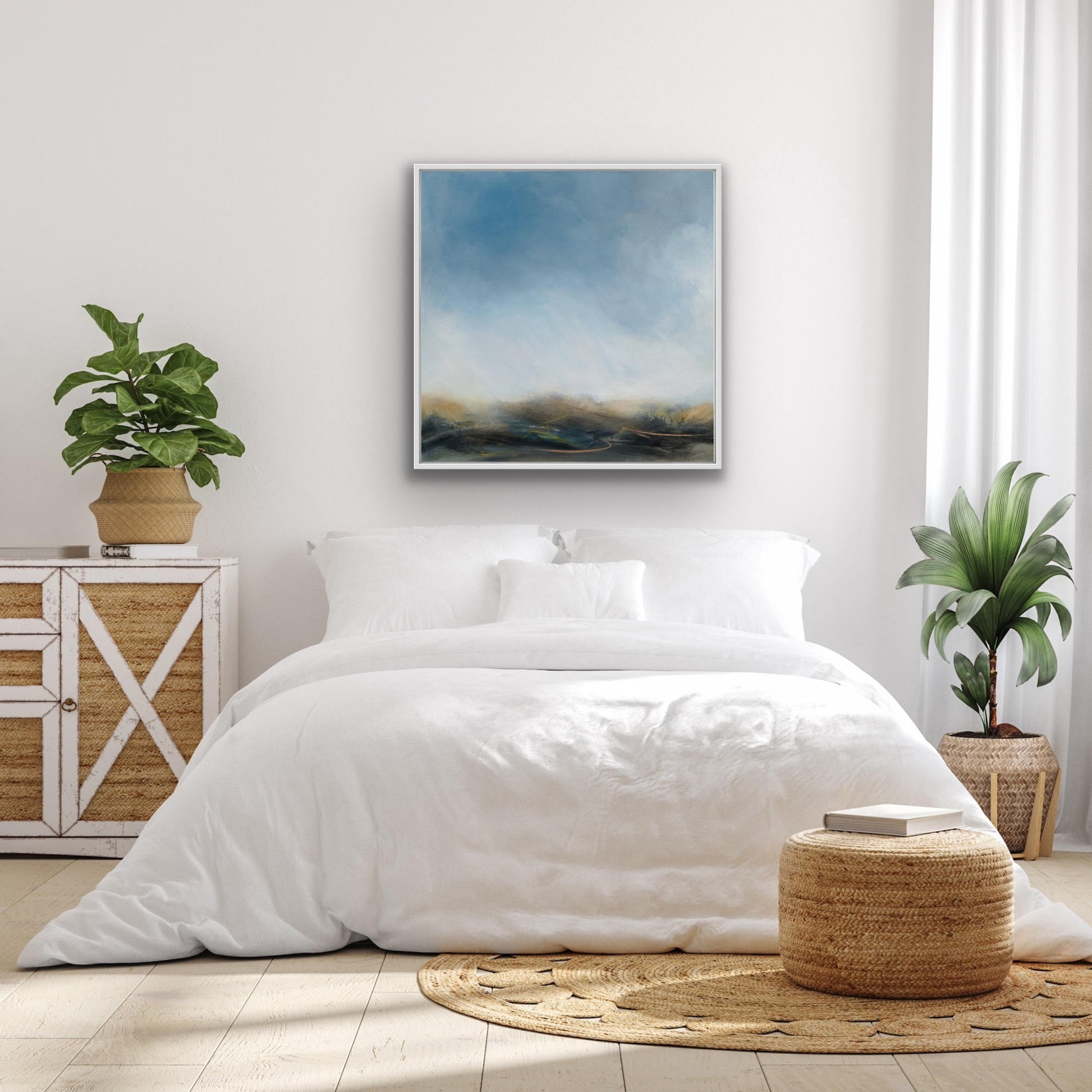 A peaceful glimpse of a sunny day, Upwards evokes the wide-open landscapes of Cornwall and Devon. Soft layers of blue and white form a gentle sky, stretching across a spacious terrain touched with subtle greys and a whisper of gorse.