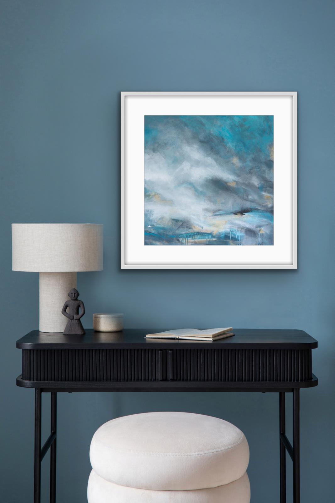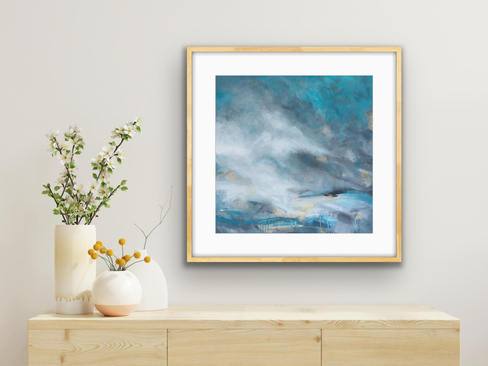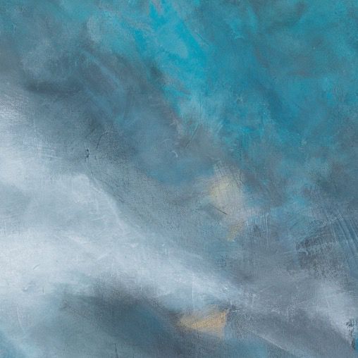 Created over layers to imbue the feel of the elements in a vast sky, with pops of gold amongst greys and teal and prussian blue, an atmospheric painting that brings life and energy and colour to your home.