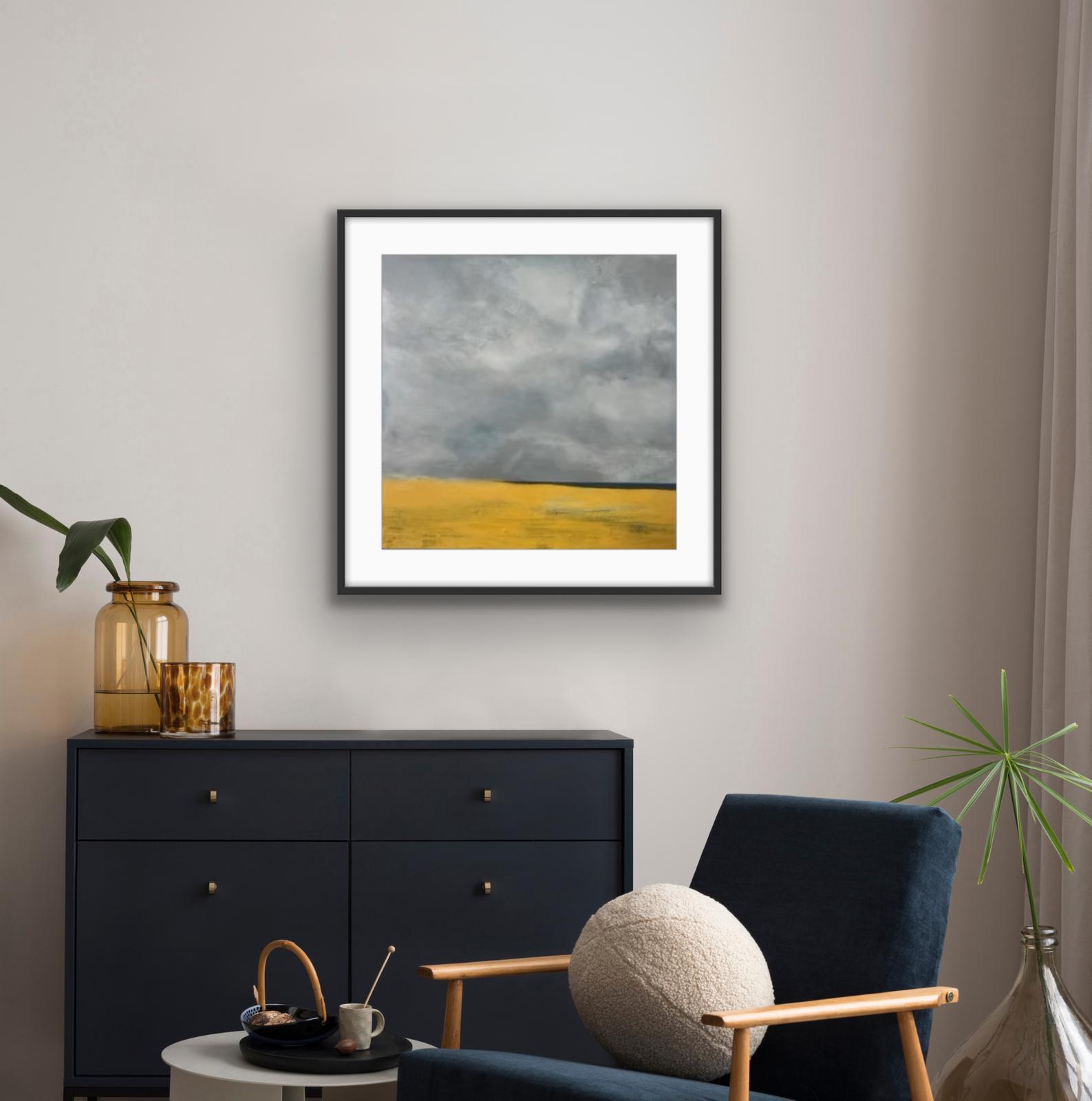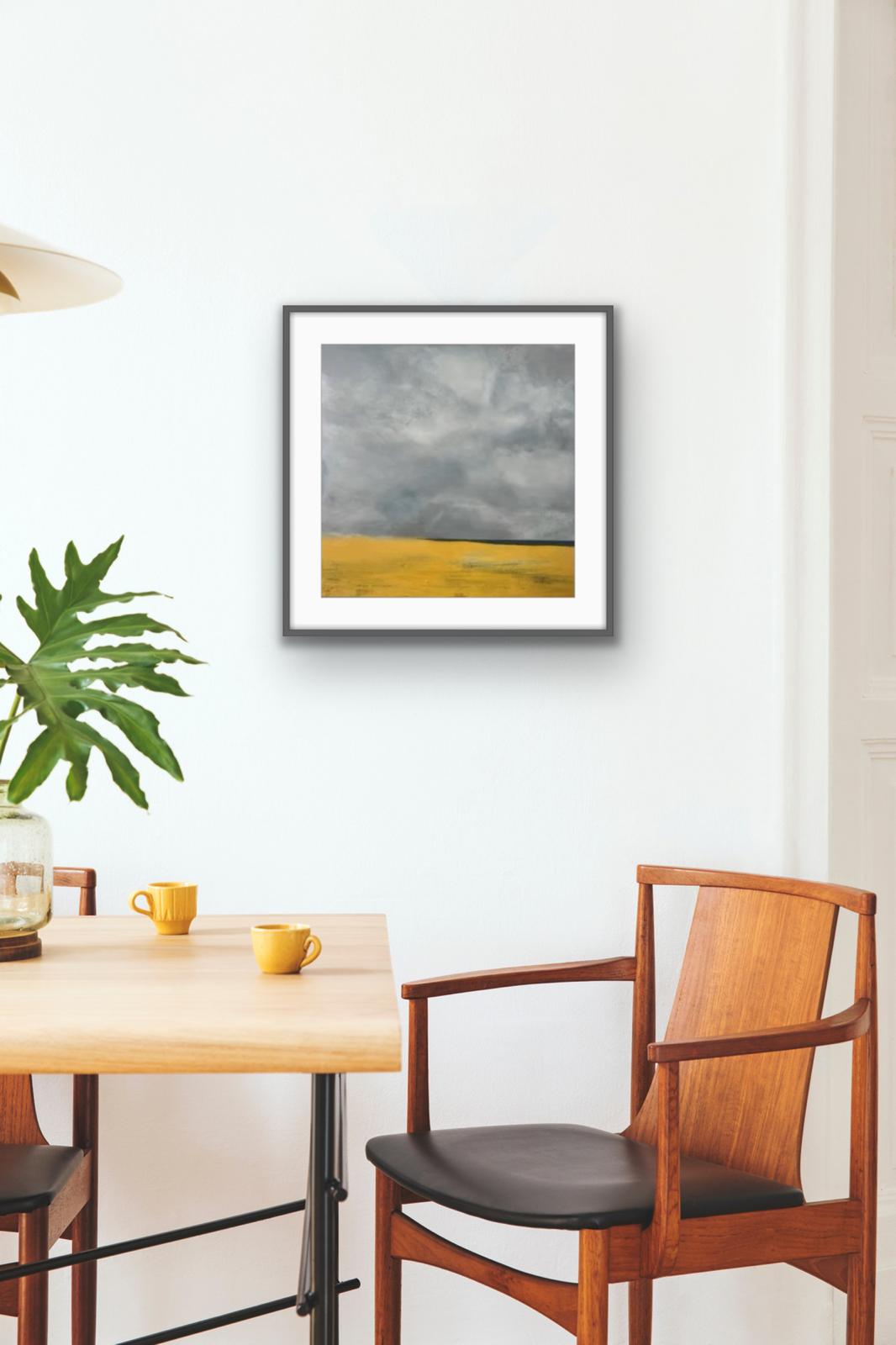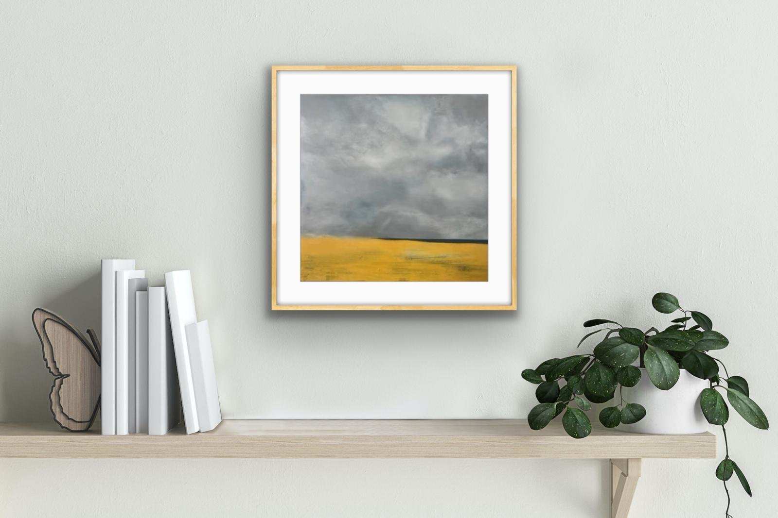 This painting depicts a bright splash of yellow drift underpinning a wonderfully grey cloudy expansive sky.