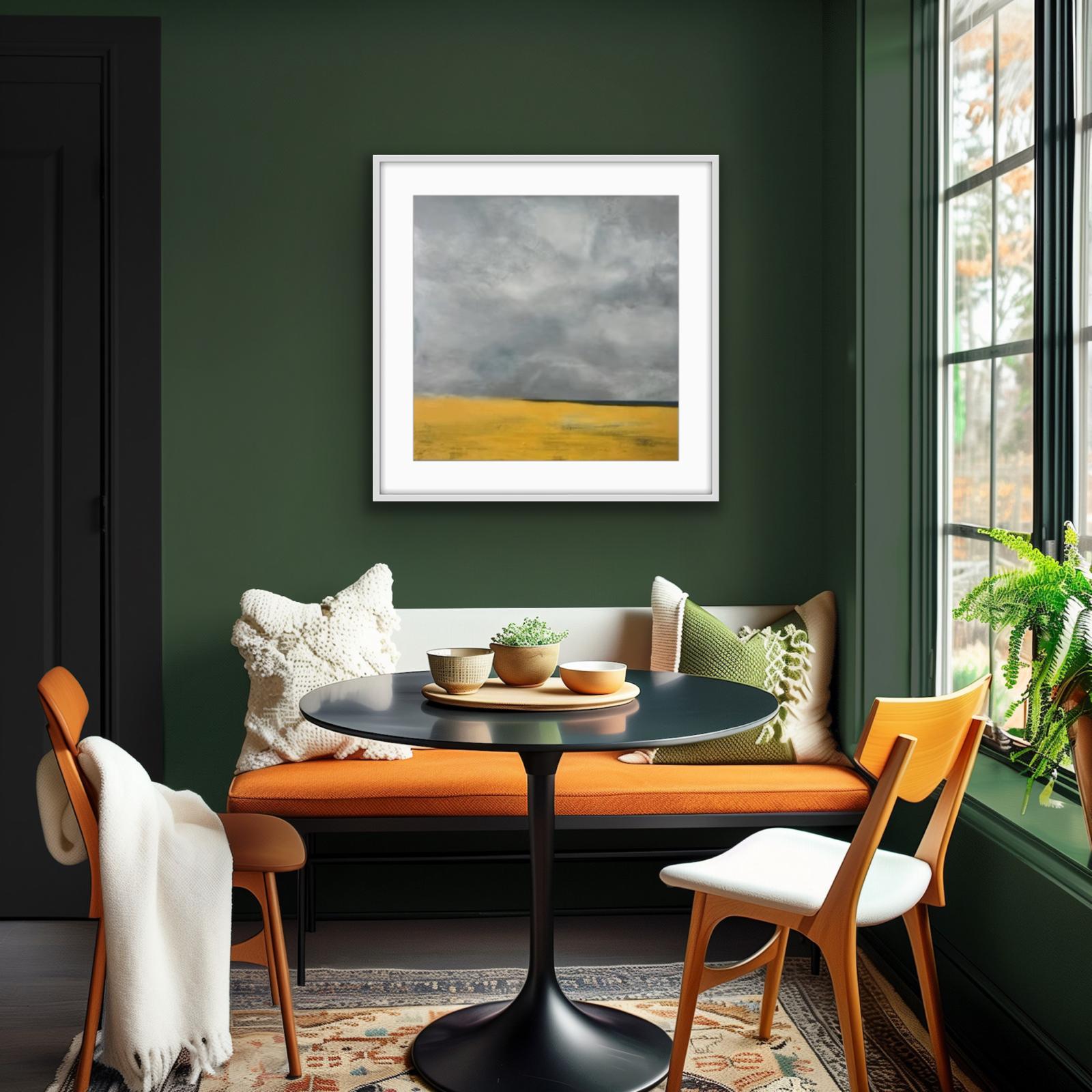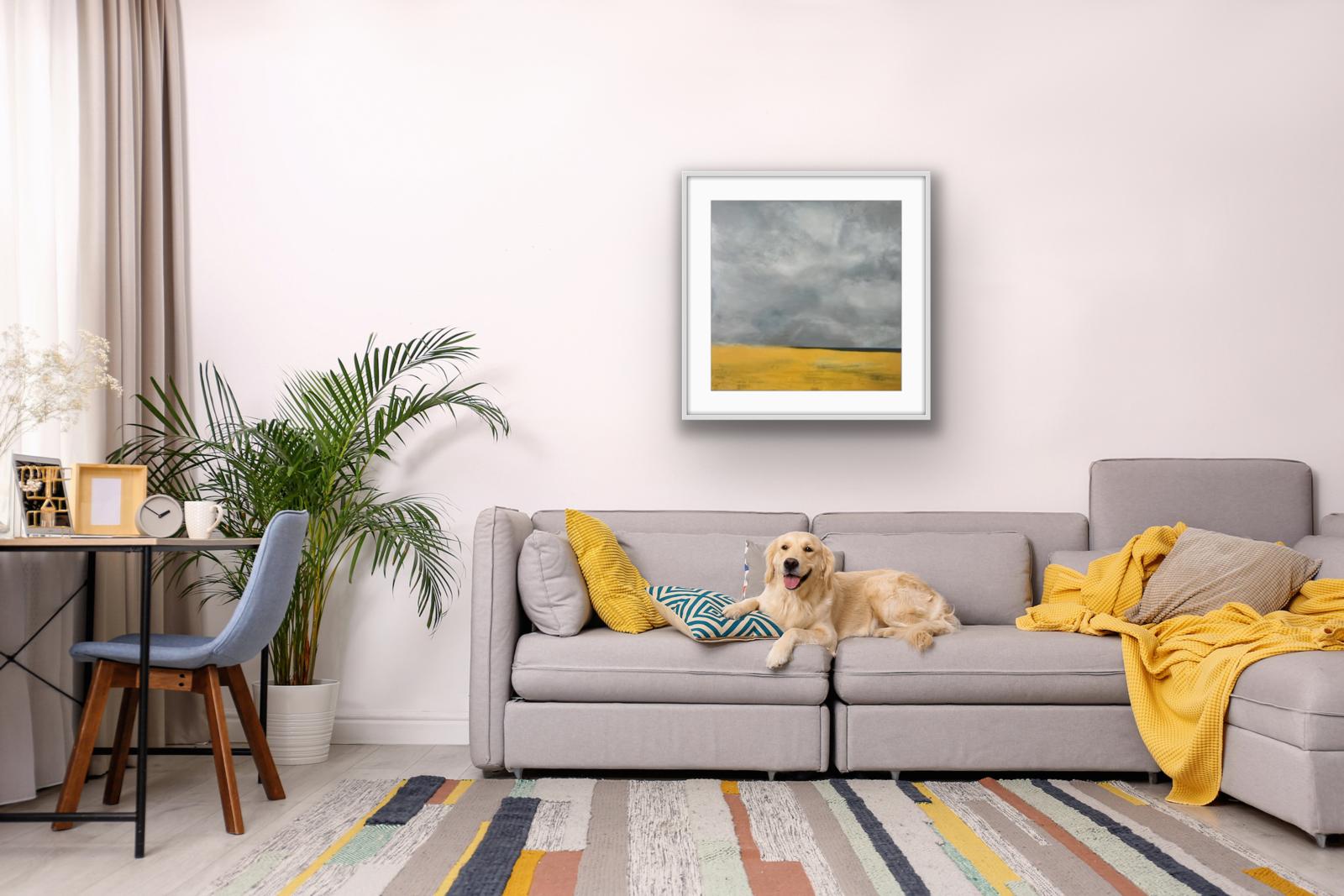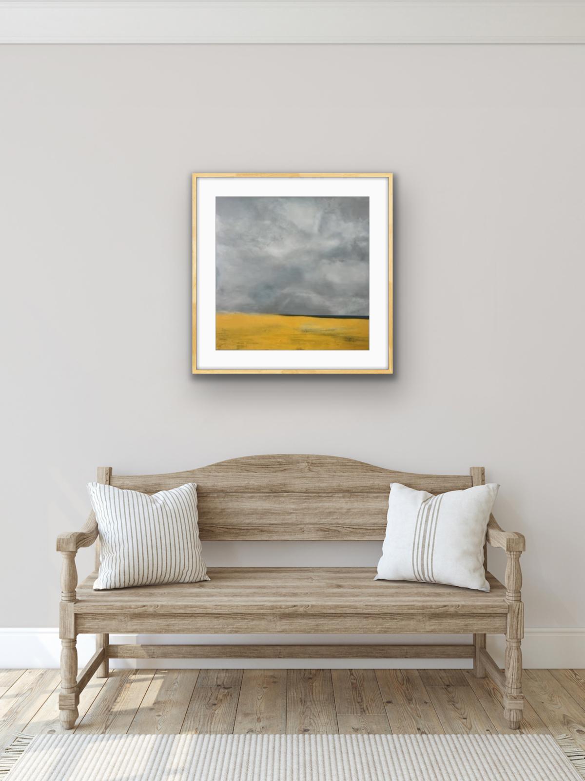 This painting depicts a bright splash of yellow drift underpinning a wonderfully grey cloudy expansive sky.